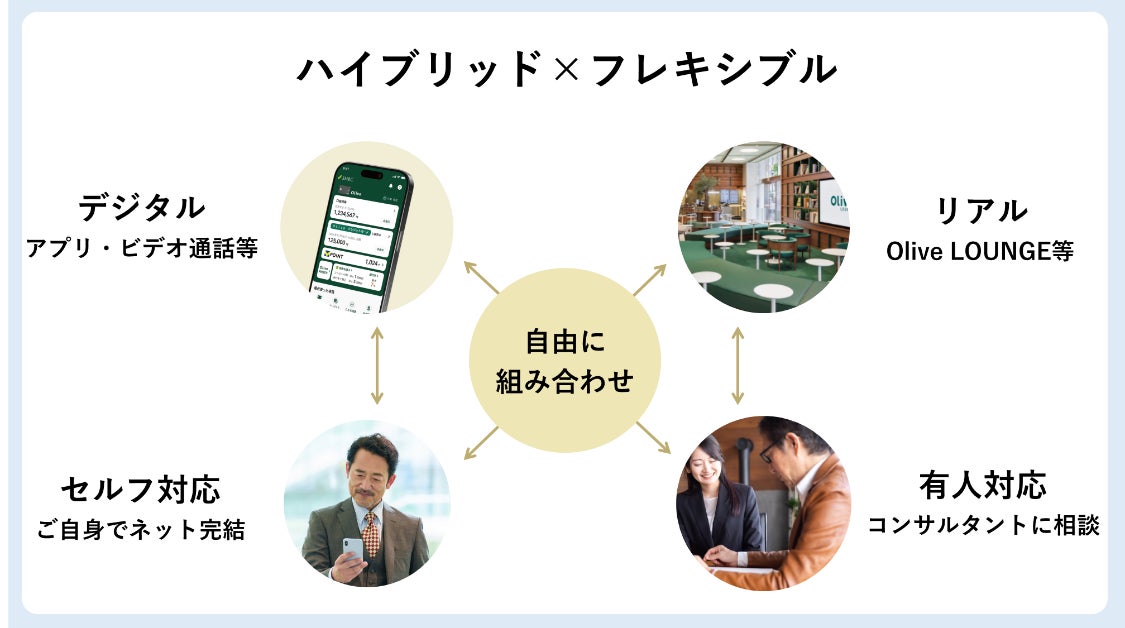 今後、こうしたお客さまの新たなニーズに対応していくためには、デジタルをベースとしながらも、ニーズに即したコンサルティングを組み合わせたサービスを提供し、お客さまが複数の選択肢から、ライフスタイルに応じて柔軟に選択し、自由に組み合わせて利用して頂くことが重要であると考え、今般、SMBCグループとSBIグループの強みを結集して、Oliveの資産運用サービスをアップグレードすることに合意しました。
