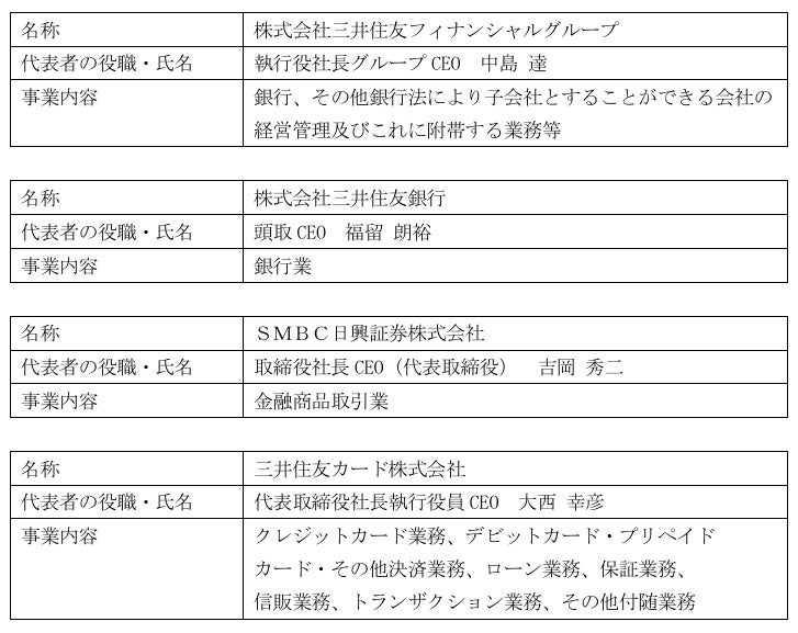 株式会社三井住友フィナンシャルグループ(執行役社長グループCEO:中島 達、以下、「三井住友フィナンシャルグループ」、当社グループを総称して「SMBCグループ」)、株式会社三井住友銀行(頭取CEO:福留 朗裕、以下、「三井住友銀行」)、SMBC日興証券株式会社(取締役社長CEO(代表取締役):吉岡 秀二、以下、「SMBC日興証券」)及び三井住友カード株式会社(代表取締役社長執行役員CEO:大西 幸彦、以下、「三井住友カード」)とSBIホールディングス株式会社(代表取締役会長兼社長:北尾 吉孝、以下、「SBIHD」、当社グループを総称して「SBIグループ」)及び株式会社SBI証券(代表取締役社長:髙村 正人、以下「SBI証券」)は、Oliveの新たな資産運用サービス(以下、「新共同サービス」)を両グループ共同で作り上げる目的で、「個人向け資産運用サービスに関する業務提携契約」(以下、「本業務提携」)を締結いたしました。