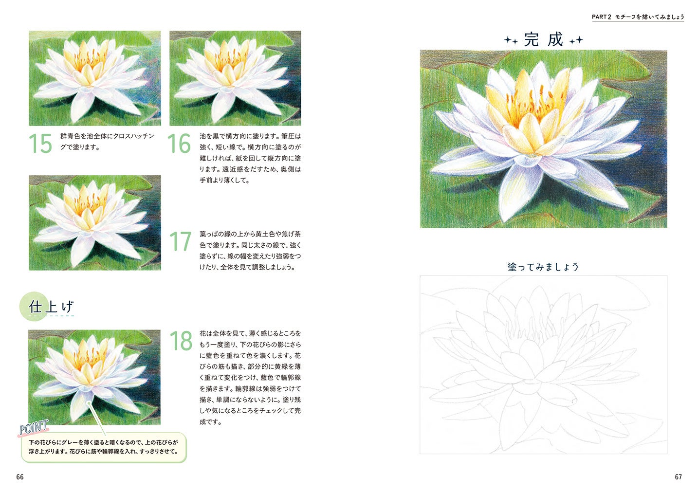 さらに、お手本を見ながらなぞったり、塗ったりできる練習つきで上達していくステップを感じられます。大きな写真とテキストで見やすく、ていねいなプロセス解説でわかりやすい。