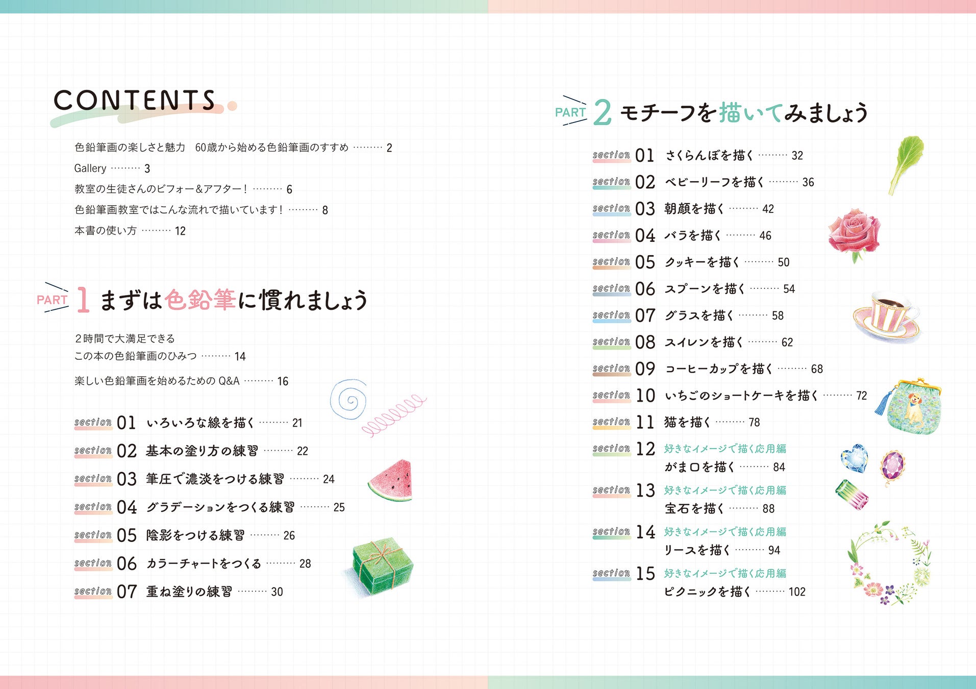 といった色鉛筆画をはじめるときの疑問から、季節の花、おいしいお菓子、キラキラ光るグラス、かわいい動物などの身近なモチーフの描き方プロセスまでをていねいに紹介。