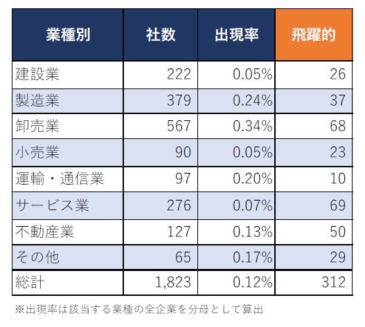 また、年売上高が5倍以上に伸びた企業を「飛躍的成長」企業と定義すると、1,823社中17.1%にあたる312社が該当した。