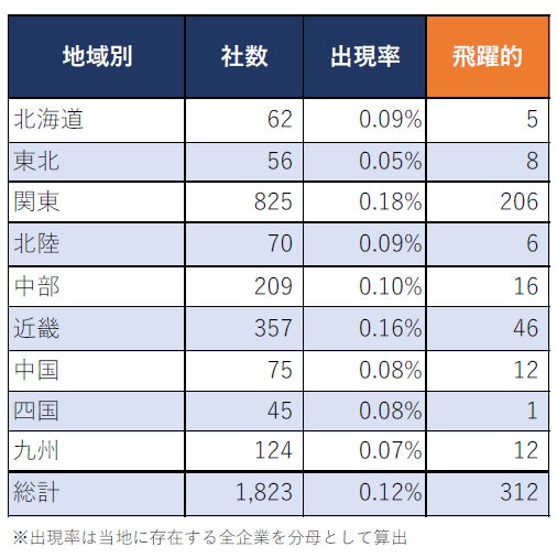 100億円企業の所在地を地域別に見ると、東京都を含む「関東」が825社(うち飛躍的成長企業は206社)と突出している。次いで、「近畿」(357社)、「中部」(209社)となり、商圏規模を確保できる都市圏が続いた。全企業数に占める100億円突破企業の割合(本稿では「出現率」と表記)で見ても上記3地域が上位となる。