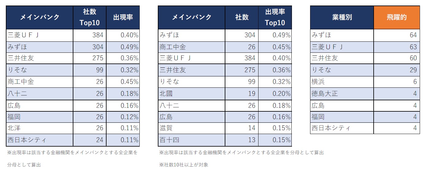100億円企業をメインバンク別に見ると、社数ベースでは「三菱UFJ」(384社)、「みずほ」(304社)、「三井住友」(275社)とメガバンクが上位を占めている。