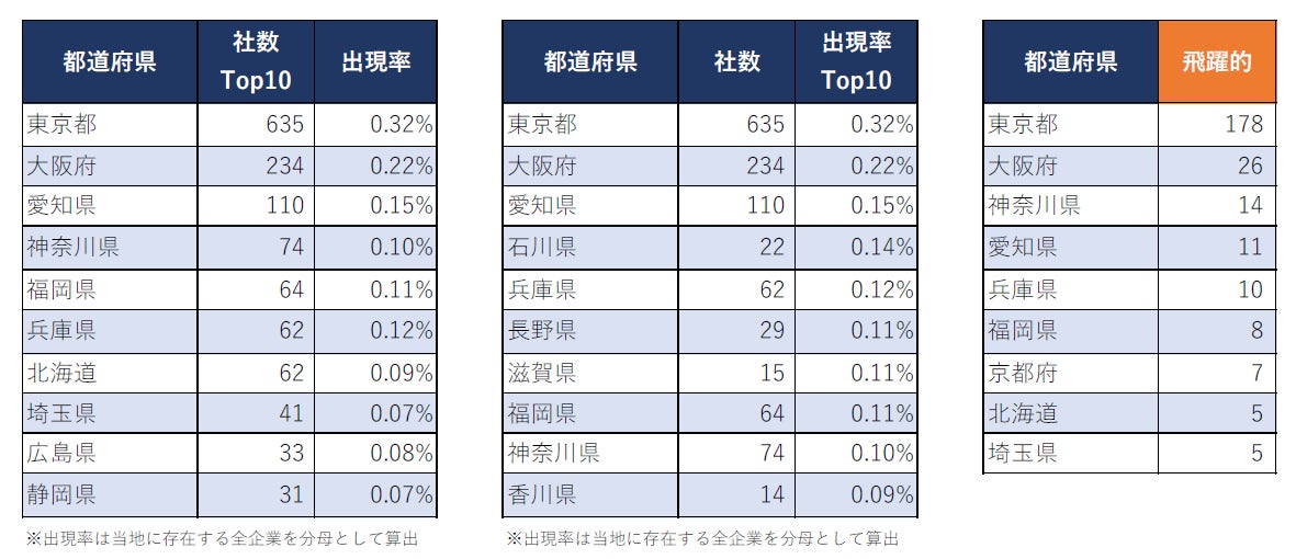 都道府県別に見ると、社数ベースで上位となるのは「東京都」(635社)、「大阪府」(234社)、「愛知県」(110社)で、そのほかでも地方の中核都市がランクインしている。