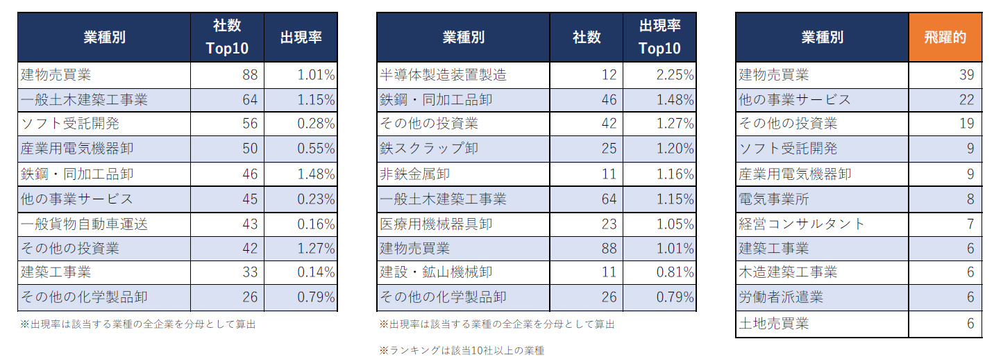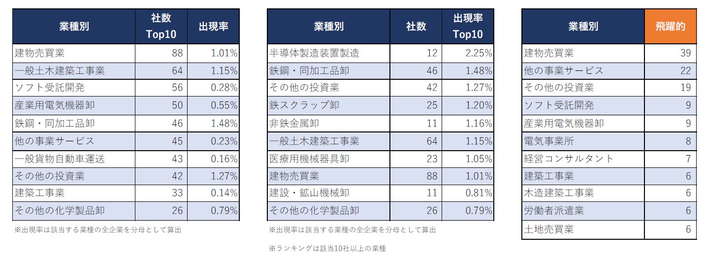 出現率で見ると、市場成長が続く半導体関連の「半導体製造装置製造」が最も高い2.25%となり、50社に1社は100億円突破企業であることが分かった。以下、相場変動により業績が膨らみやすい「鉄鋼・同加工品卸」(1.48%)、「投資業」(1.27%)、「鉄スクラップ卸」(1.20%)が続く。