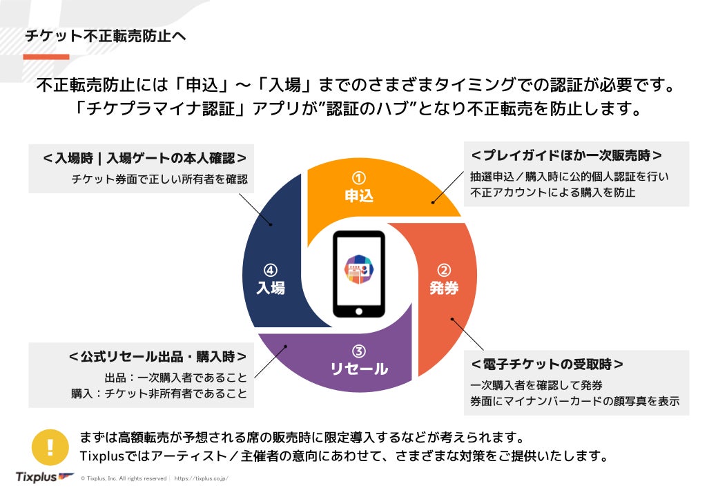 電子チケット事業やチケット二次販売「チケプラトレード」を運営する株式会社Tixplus(本社:東京都渋谷区、代表取締役:池田 宗多朗)は、チケット不正転売抑止のために、総務省とデジタル庁が推進するマイナンバーカードを用いた公的個人認証を活用すべく、公的個人認証プラットフォーム事業者としての認定を取得いたしました。これにより、チケプラはマイナンバーカードの公的個人認証を自社単独で利用できるようになり、チケット不正転売対策をより一層強化したサービスの提供が可能となります。大臣認定は、エンターテインメント領域の事業者としては当社が初めてとなります。