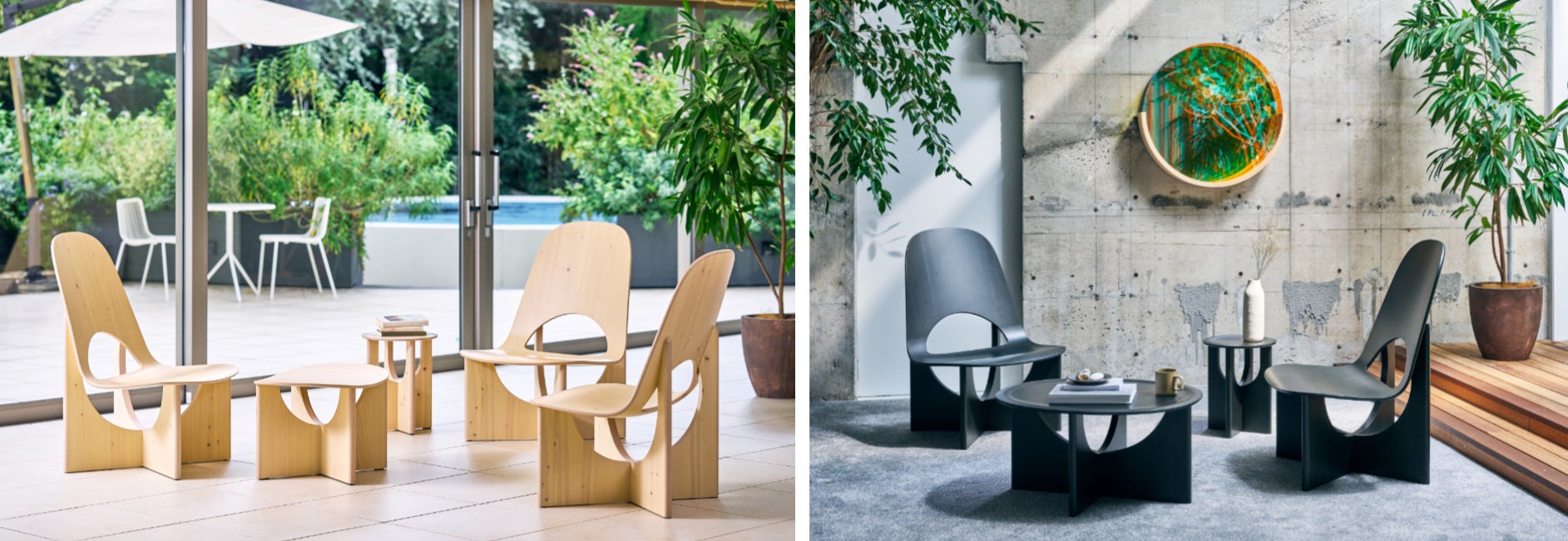 十字に交わった脚が目を引く存在感のある美しいデザインと、ゆったりとした座り心地を兼ね備えたラウンジチェアー、オットマン、ローテーブル、サイドテーブルをラインナップしています。本体カラーは、ライトナチュラル、ライトグレー、ペールブラックの3色です。