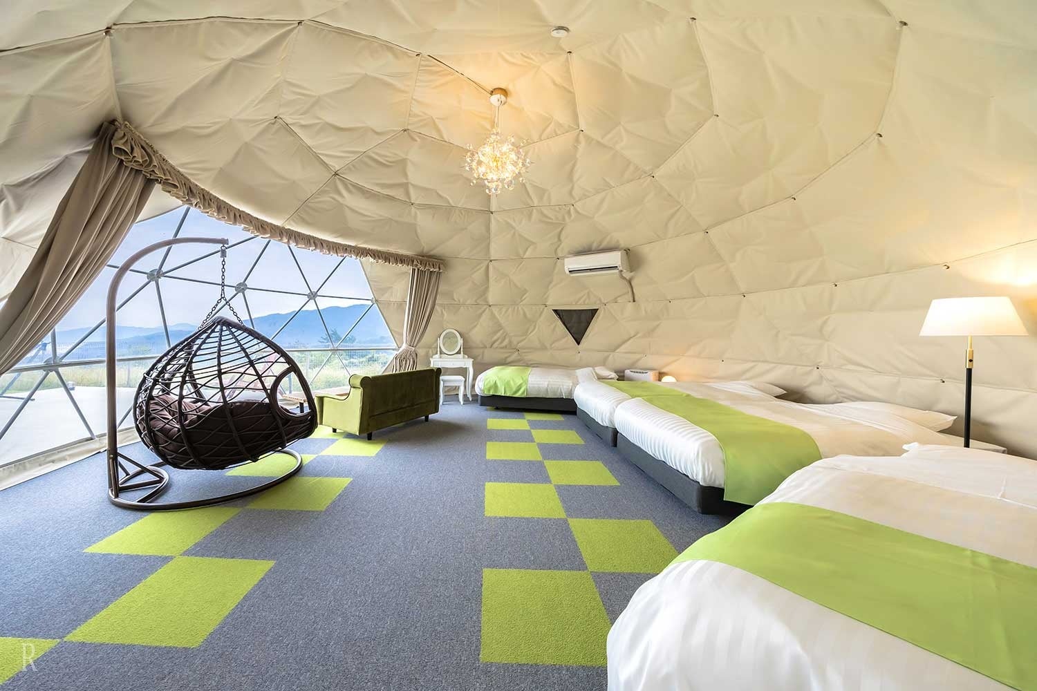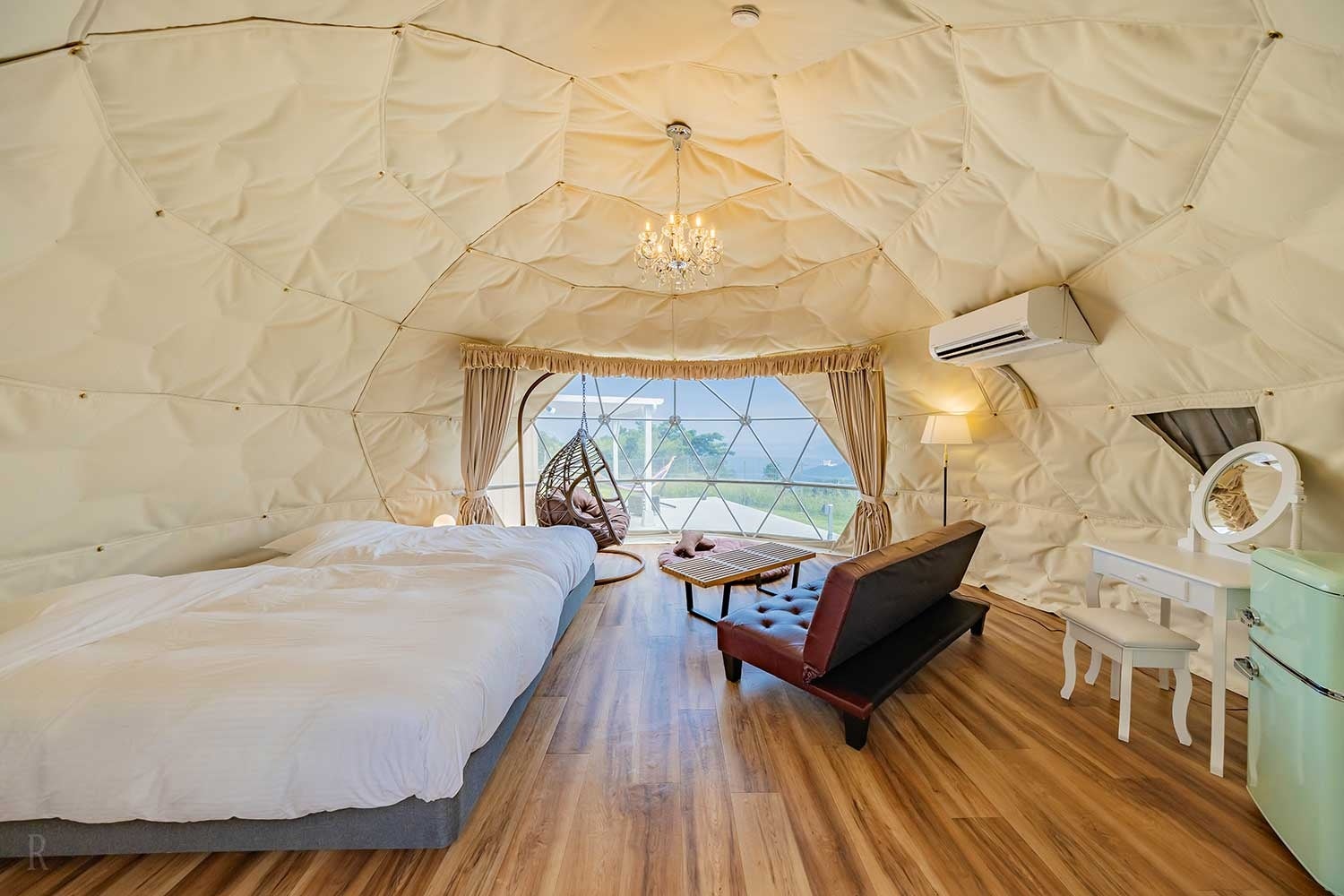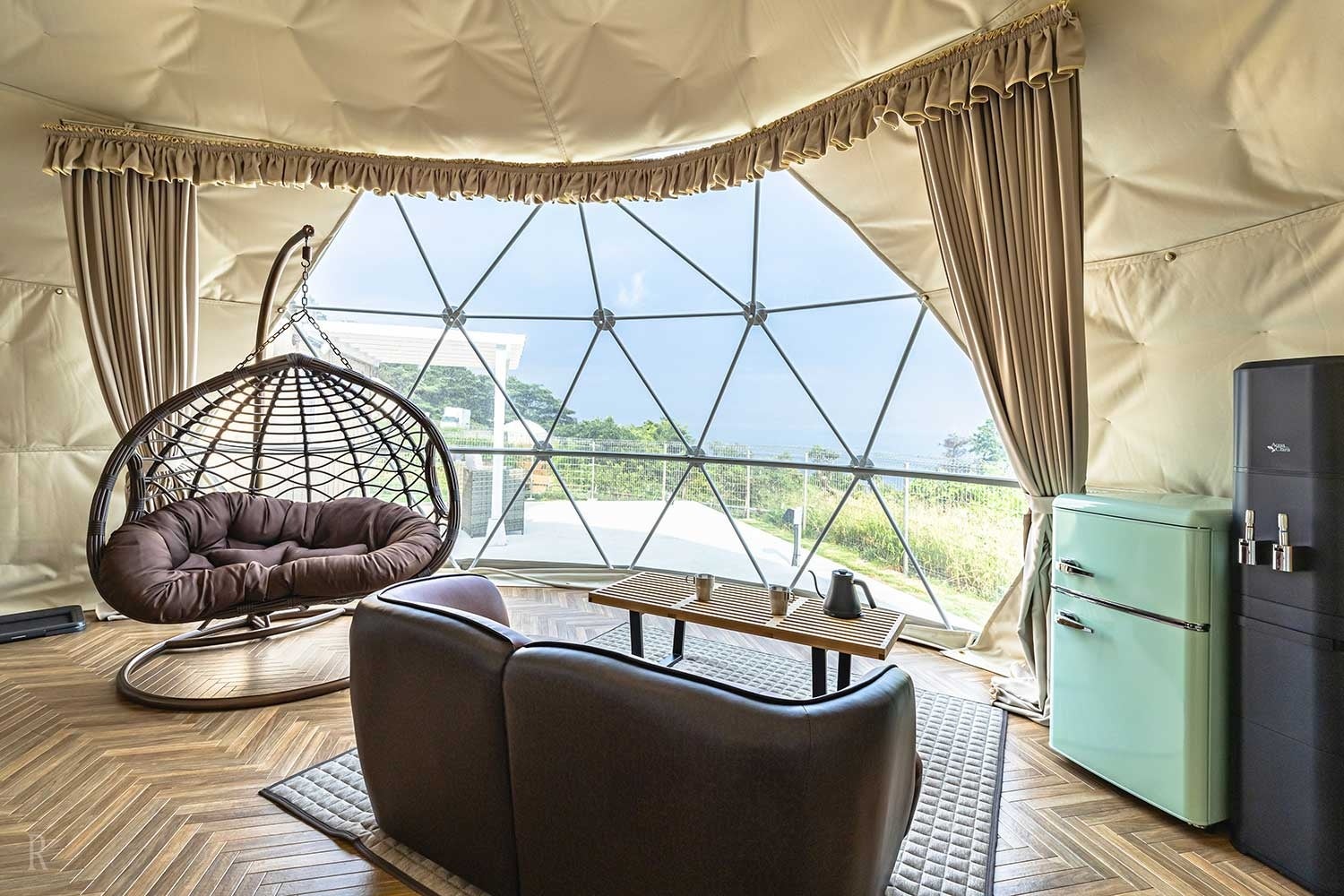 相模湾を見下ろす高台に、適度な距離を保って配置された4棟のドームテント。周囲には民家もなく、夜には満天の星空を独り占めできる完全な非日常空間です。冷暖房完備の上質な室内で、四季折々の伊豆の表情を楽しみながらプライベートな休日をお過ごしいただけます。