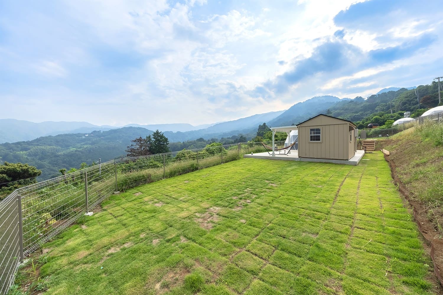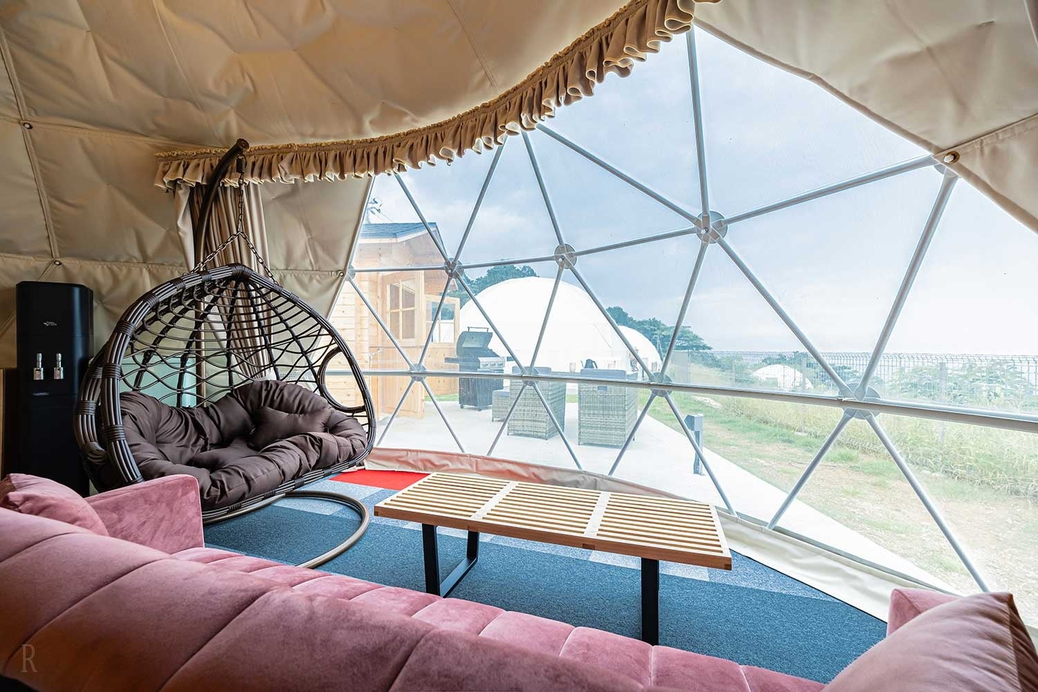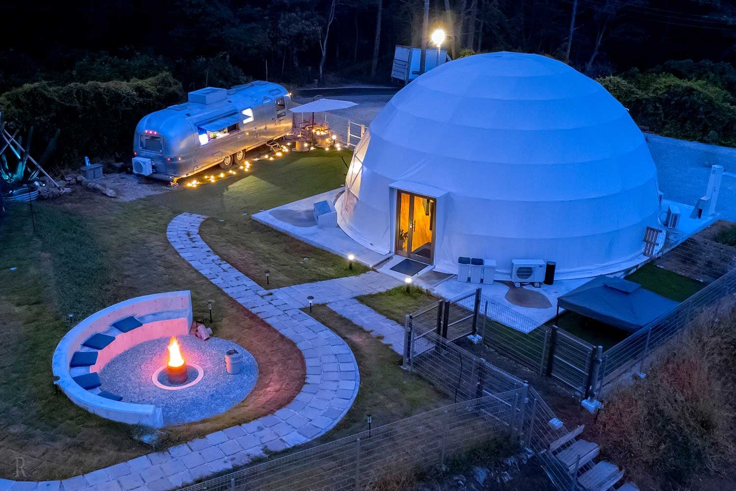相模湾を見下ろす高台に、適度な距離を保って配置された4棟のドームテント。周囲には民家もなく、夜には満天の星空を独り占めできる完全な非日常空間です。冷暖房完備の上質な室内で、四季折々の伊豆の表情を楽しみながらプライベートな休日をお過ごしいただけます。