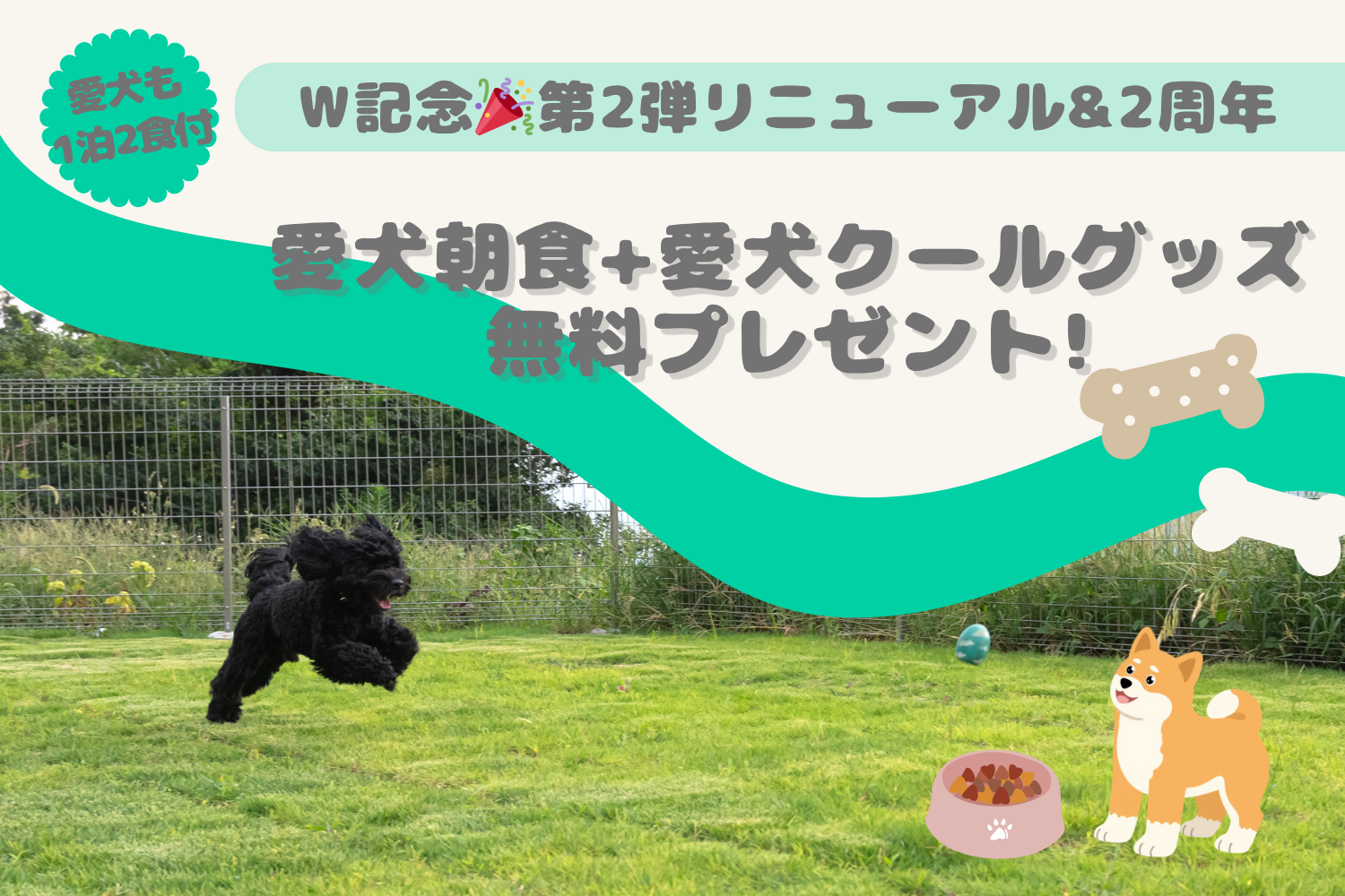 あわせて、日頃の感謝を込めた「W(ダブル)記念キャンペーン」として、宿泊代金が最大20%OFFになる特別プランや、愛犬の食事を朝夕フルサービスする限定特典の提供を開始いたします。