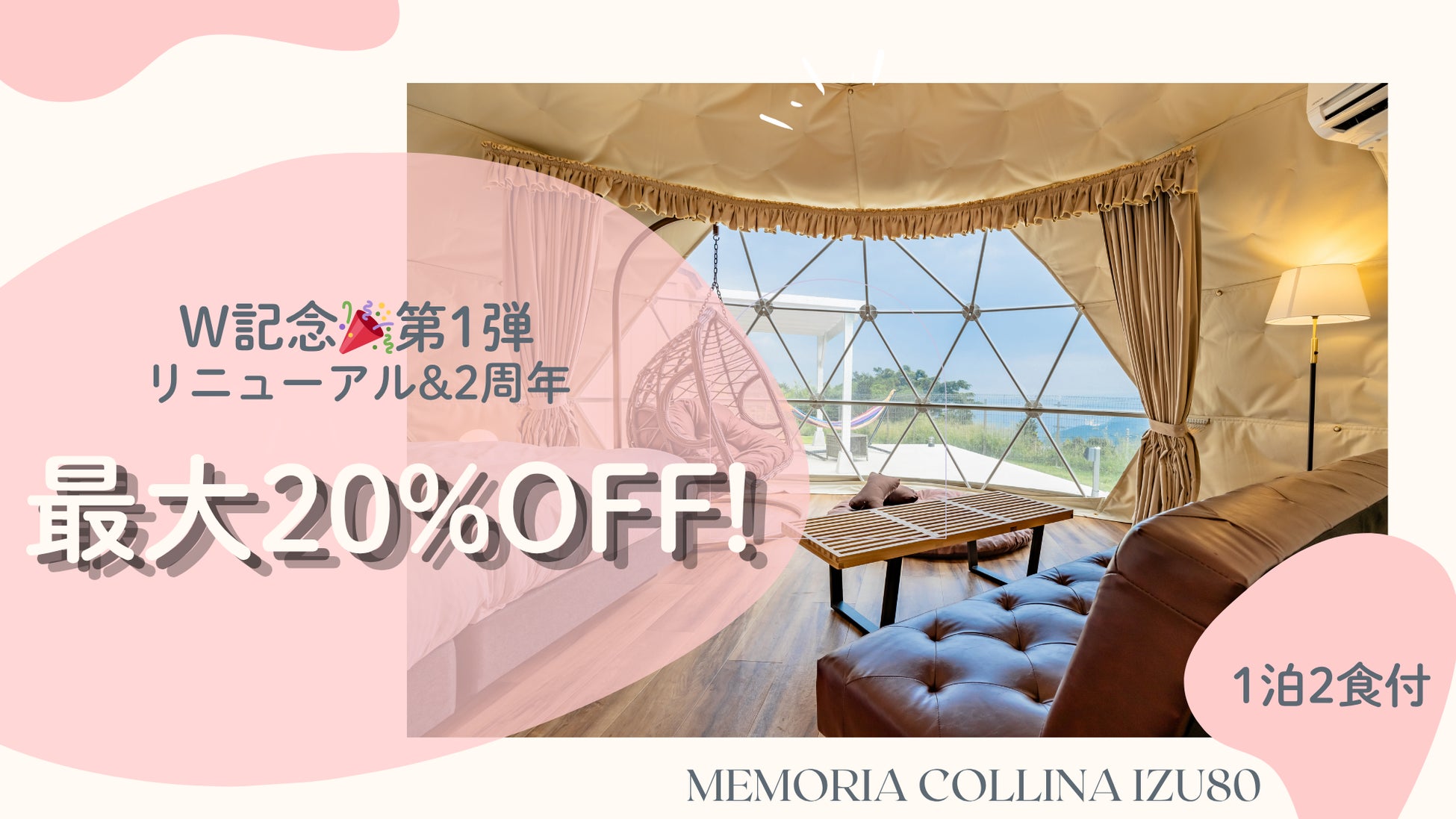【1泊2食付・最大20%OFF】伊豆の高台に佇む絶景グランピング〈メモリアコリーナ伊豆80〉が、5月10日より「全部屋ドッグフレンドリー」へリニューアル!開業2周年を記念した豪華Wキャンペーンも開催