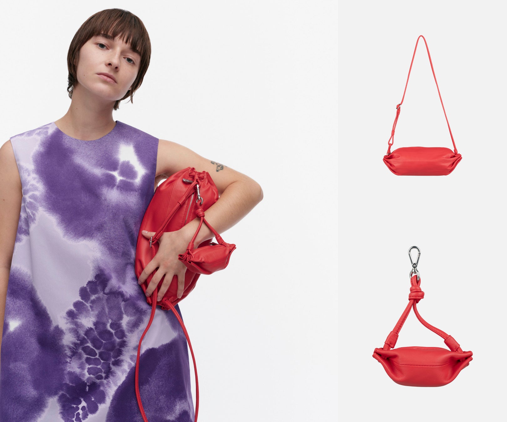 また、各新色に合わせたカルラ ポケットポーチも登場します。カルラ ポケットポーチは、アイコニックなカルラのシルエットをそのままミニチュアにしたような、ストラップデザインのコンパクトポーチ。お手持ちのカルラ バッグと組み合わせて自分らしいスタイルを楽しんだり、ベルトループにフックしてスタイリングのワンポイントとしても取り入れられるプレイフルなアイテムです。