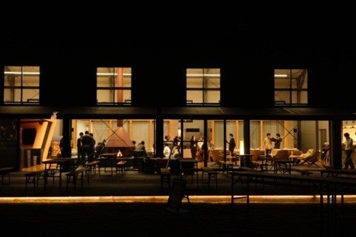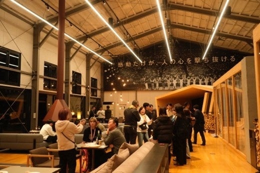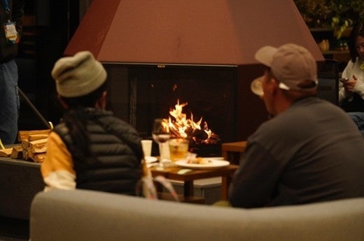 今年ははじめて、ナイトタイムを開催しました。背景には、西湖収穫祭は出店者同士の交流を生み出すことも目的のひとつとしていますが、マルシェの間ではなかなかその時間をつくれないとの声が寄せられたことがあります。会場はアミューズ ヴィレッジ内の「TAI-IKU-KAN」。体育館をリノベーションしてつくられ、普段はオフィスとして使用されている場所ですが、この日は暖炉に火を入れ、特別な空間となりました。