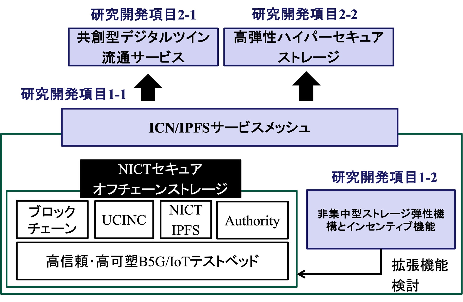 そのためにまず、研究開発項目 1として、サービスメッシュフレームワークや弾性機構にてNICT セキュアオフチェーンストレージと任意の非集中型アプリをコンテンツ指向で連携させるための仕組みを開発し、任意の非集中型アプリに対してコンテンツ流通に秘匿性や弾性を持たせつつも、ユーザに参加インセンティブを与える仕組みを実現します。