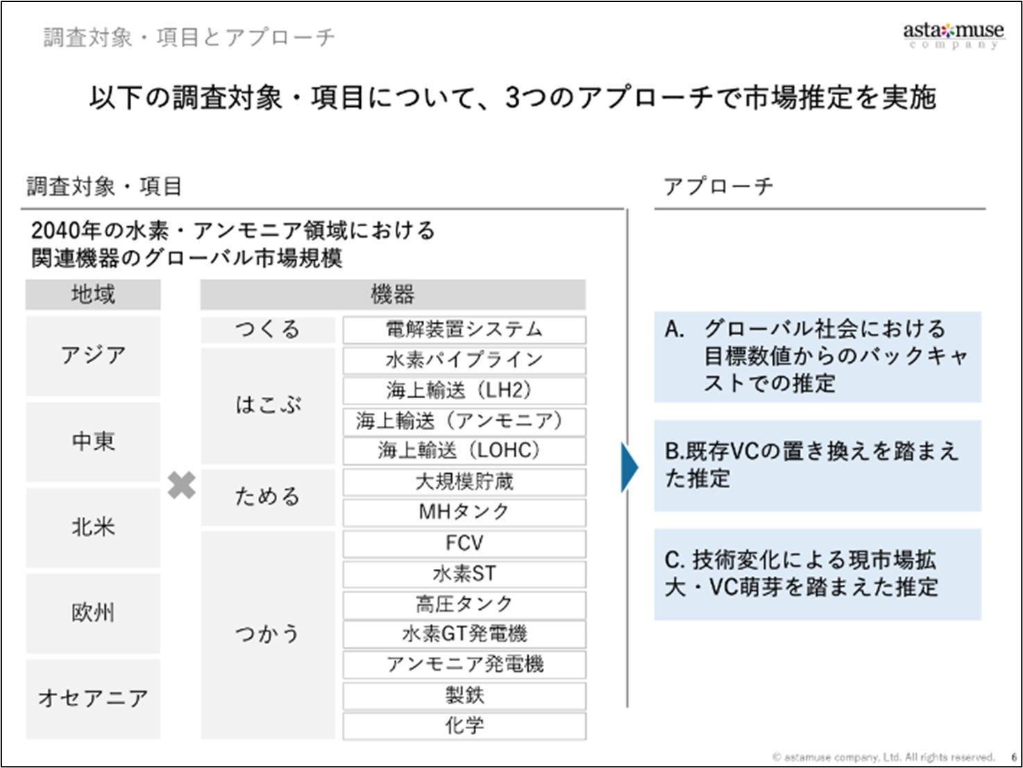 本レポートは、2040年の水素・アンモニア領域における関連機器のグローバルの市場規模推定を目的として下記3つのアプローチを実施しています。