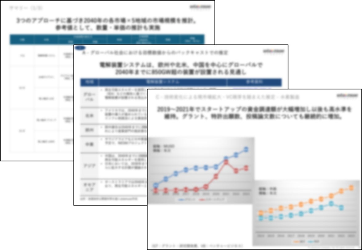 そんな中、本レポートは、アスタミューゼが保有する特許・論文・投資・助成金(グラント)などの独自データベースも活用し、2040年までの中長期的な需要構造・技術シナリオを明らかにした上で緻密な市場推計を行うことで、産業界における技術開発や投資戦略の立案を支援することを目的としています。
