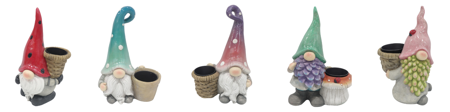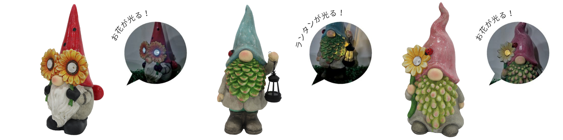ソーラーライト付きのノームや、観葉植物を飾るためのポットを持つノームなど、多彩なノームたちが揃っています。自分好みのノームを見つけるのに楽しみが広がります。