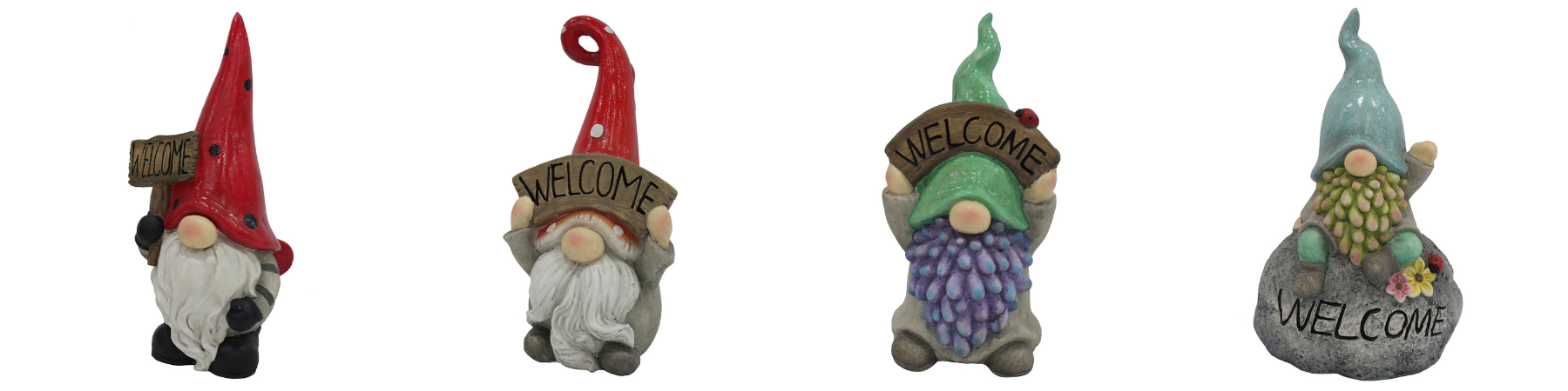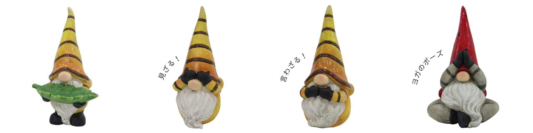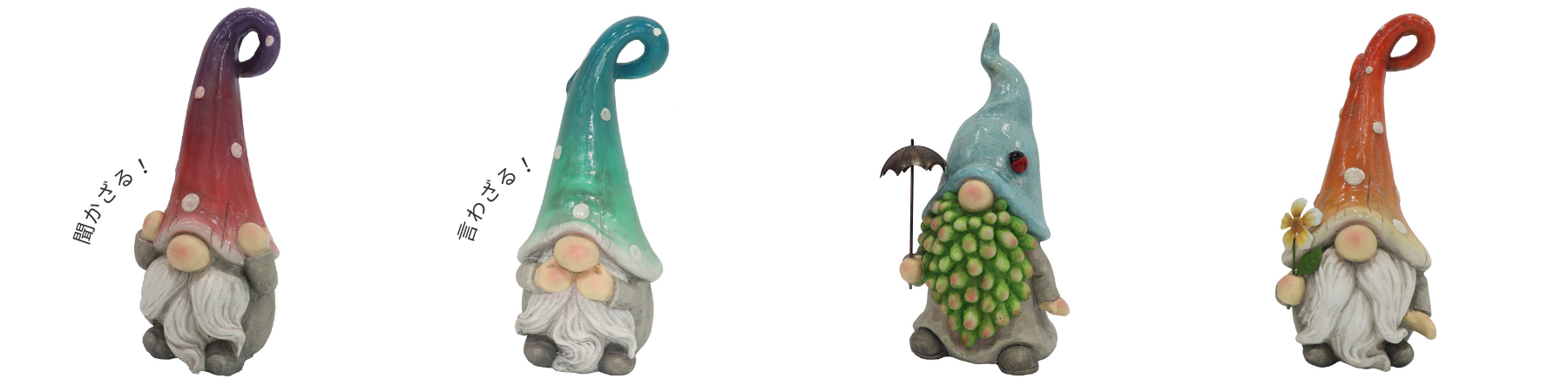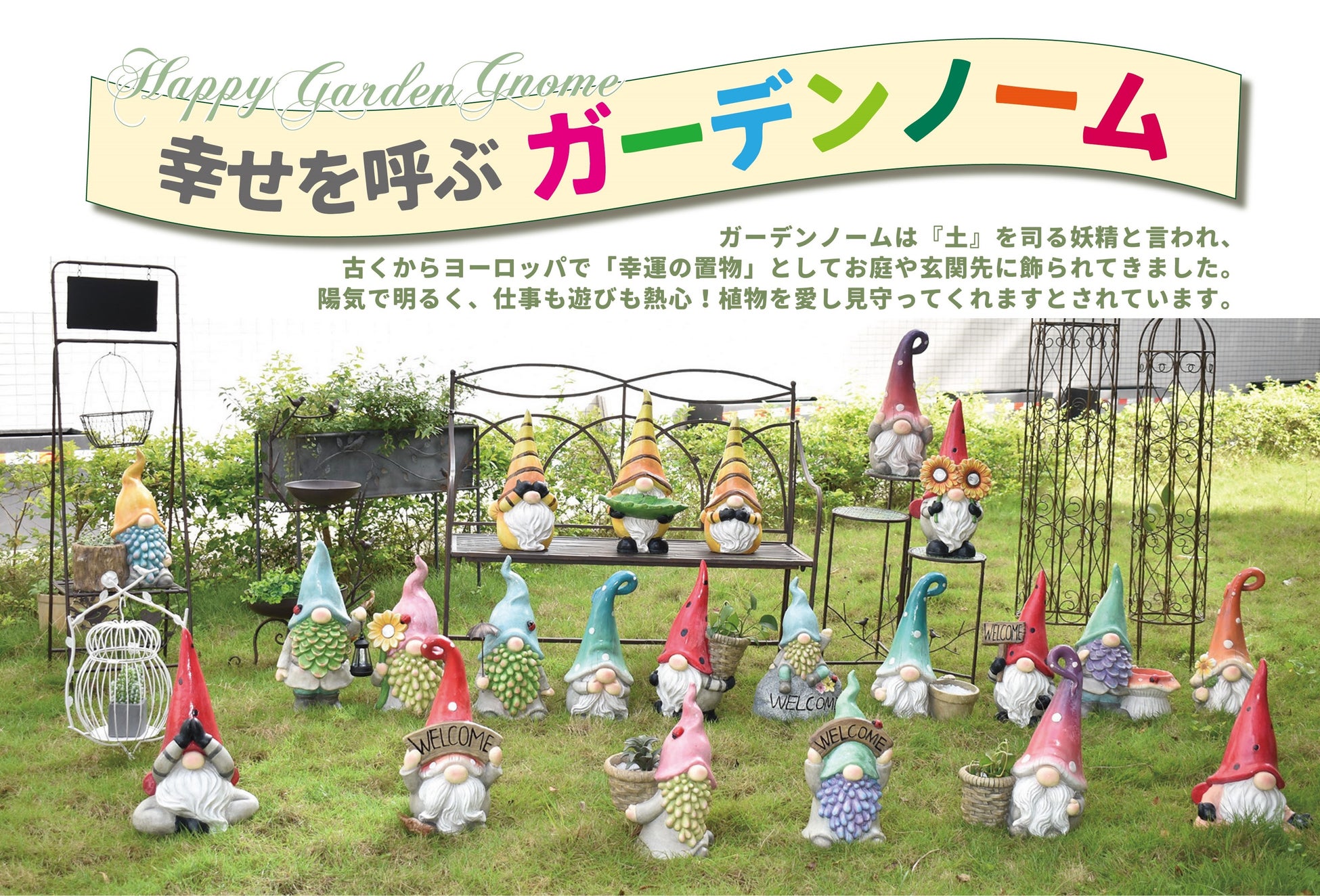 ガーデンノームは、四大精霊論で「土」を司る精霊とも言われ、古くからヨーロッパで「幸運の置物」として広く愛されてきました。とんがり帽子をかぶったノームたちは陽気で明るく、仕事も熱心!植物を愛し見守ってくれます。この小粋なノームたちの個性たっぷりな表情と存在感で、ガーデンを楽しみたい方々にぴったりのアクセントになります。