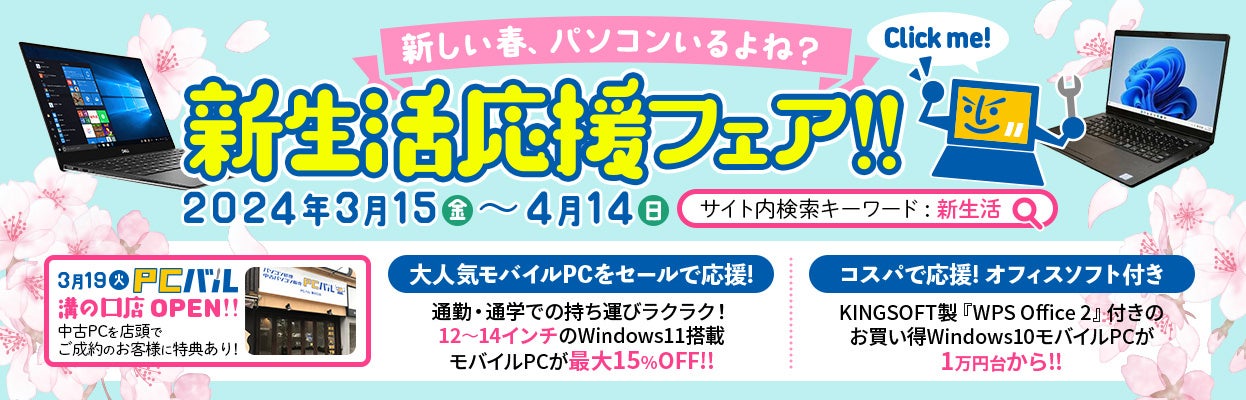2024年3月15日(金)~4月14日(日)の期間限定で、この春から進学就職などで新たにパソコンを必要とされる皆様に向けて『新生活応援フェア』を開催!通勤通学に持ち運び便利な12~14インチのWindows11搭載モバイルPCが最大15%OFF!!