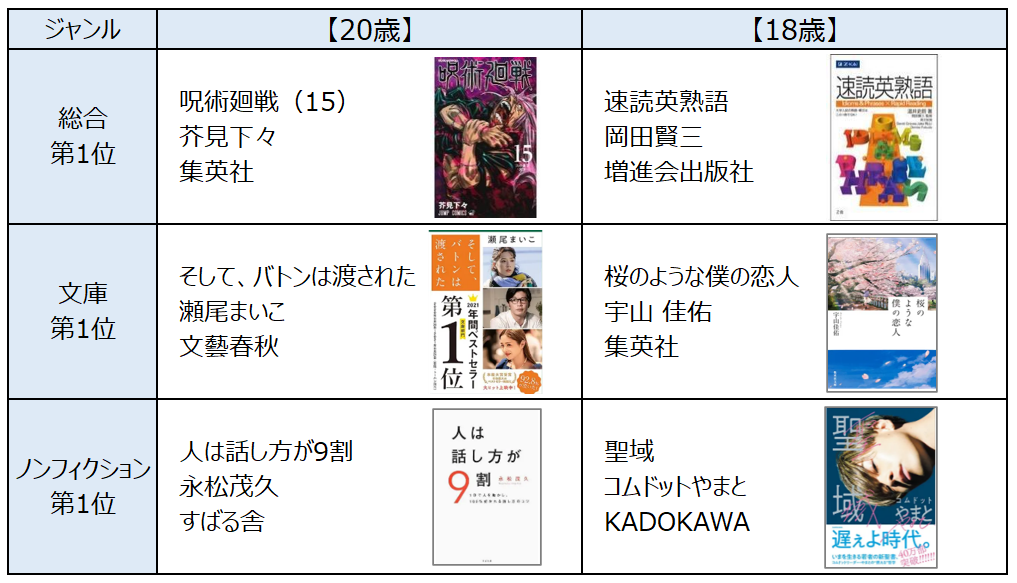 - 総合ランキング:「20歳」は『呪術廻戦』、「18歳」は「学習参考書」がトップ3を独占。