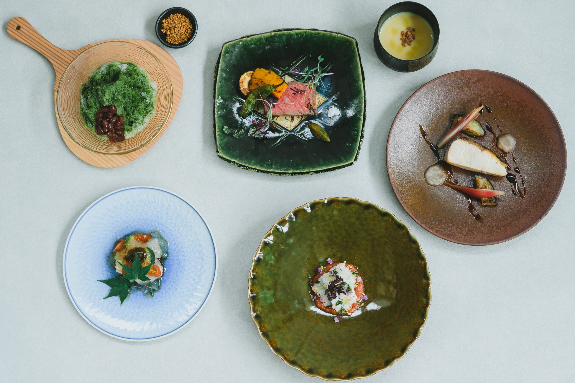 「夏の灯」のためだけにご用意した夏の涼を感じる、旬の魚や夏野菜をふんだんに取り入れた特別ディナーコース。お食事の最後には、夏らしさを感じていただける抹茶のかき氷を提供いたします。夏の夜にそっと涼を添えるお料理の数々を、ゆったりとお愉しみください。