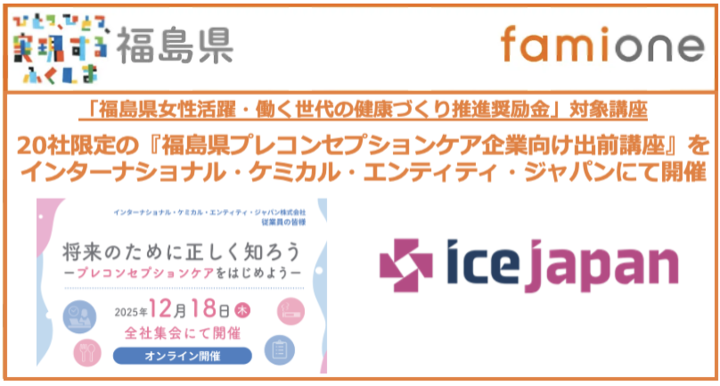 「子どもを願うすべての人によりそい 幸せな人生を歩める社会をつくる」をビジョンに掲げ、法人の従業員向け福利厚生や自治体の住民向け支援を行うヘルスケアサポートサービス「ファミワン」 https://famione.com/benefit/ などを展開する株式会社ファミワン(本社:東京都渋谷区、代表取締役:石川勇介)は、インターナショナル・ケミカル・エンティティ・ジャパン株式会社(代表取締役社長:カイラッシュディープ シャルマー博士、以下「ICEジャパン」)の全社集会にてプレコンセプションケアをテーマとした出前講座を12月18日に開催しました。