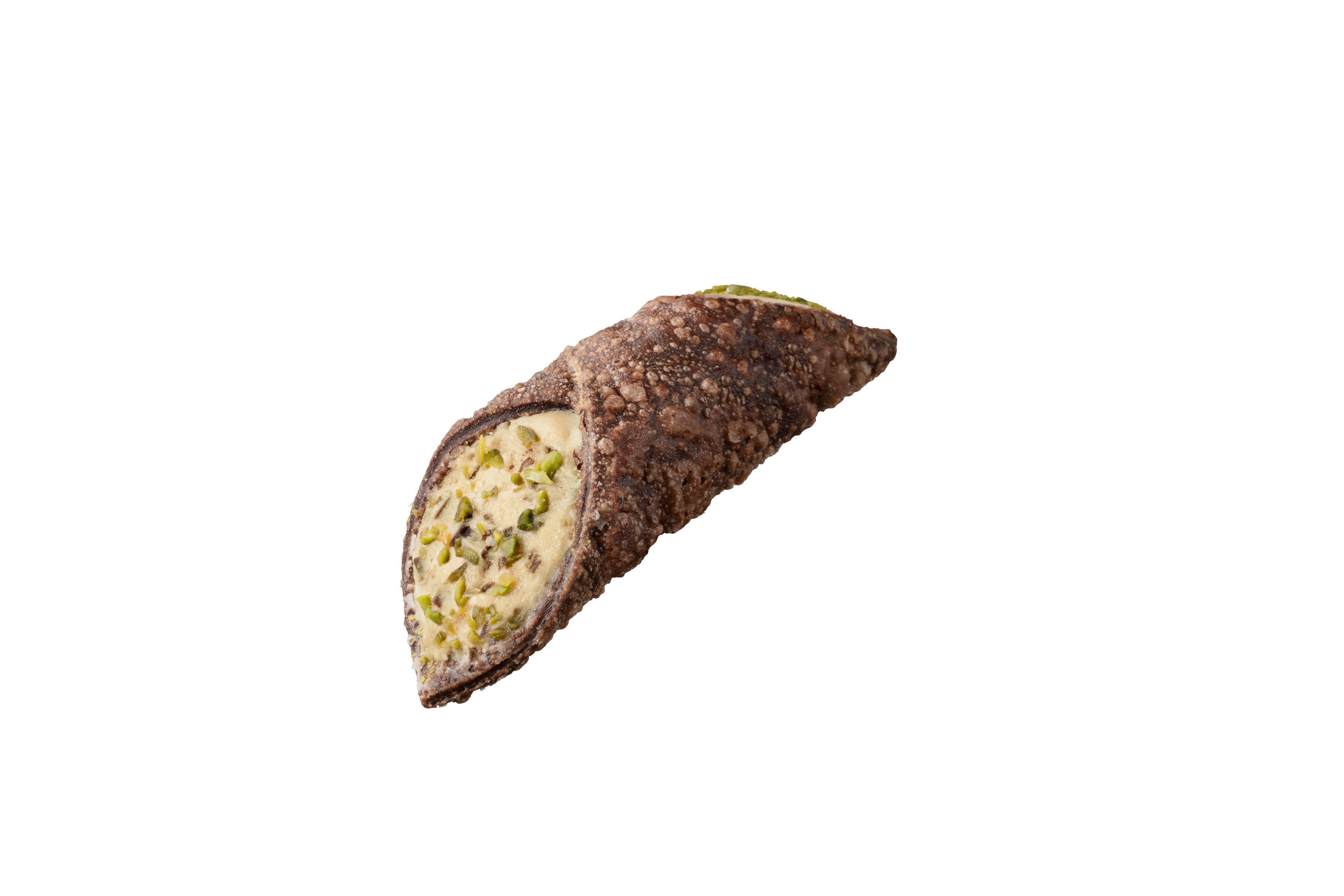 ザクッと食感のココア生地に、リコッタチーズ、クリームチーズ、ベルギー産ホワイトチョコレート、ヘーゼルナッツペースト、チョコレートチップを混ぜ合わせたクリームを詰め、ピスタチオナッツをトッピングしました。ナッツらしいコクをしっかり感じつつ、チョコレートチップの食感が楽しい一品です。