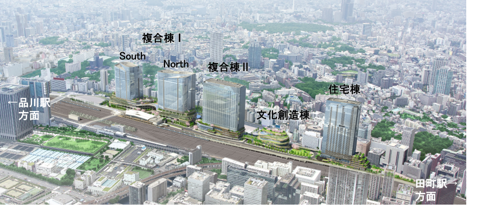 複合棟Ⅰおよび高輪ゲートウェイ駅周辺エリアを2024年度末(2025年3月)に開業し、その他の棟(複合棟Ⅱ・文化創造棟・住宅棟)および各棟周辺エリアを2025年度中に開業します。