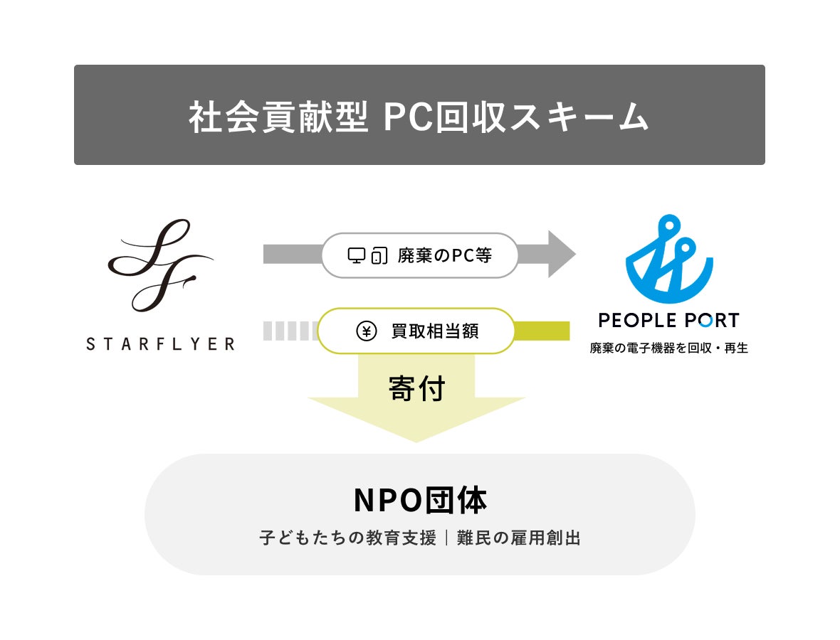 その第一弾として、ピープルポート株式会社(本社:神奈川県横浜市、代表取締役社長:青山 明弘、以下「ピープルポート」)が、スターフライヤー本社オフィスで使用されていたPCやタブレット端末など約100台を回収。廃棄を防ぐことでCO₂削減を実現するとともに、回収によって得られた買取金を公益社団法人日本環境教育フォーラムに寄付し、こどもたちへの環境教育の支援につなげます。