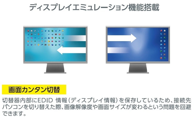 “ディスプレイエミュレーション機能”を標準搭載し、エミュレーターを追加しなくても、モニターのEDIDを保存し、パソコンの切り替え時に解像度、画面サイズを自動で最適化します。