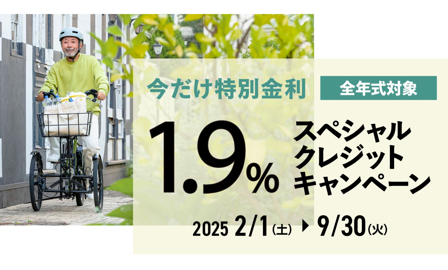 対象期間中、noslisu取扱店でnoslisu(電動アシスト自転車)またはnoslisu e(フル電動仕様)の新車をご購入の際に実質年利1.9%のスペシャルクレジットをご利用いただけます。