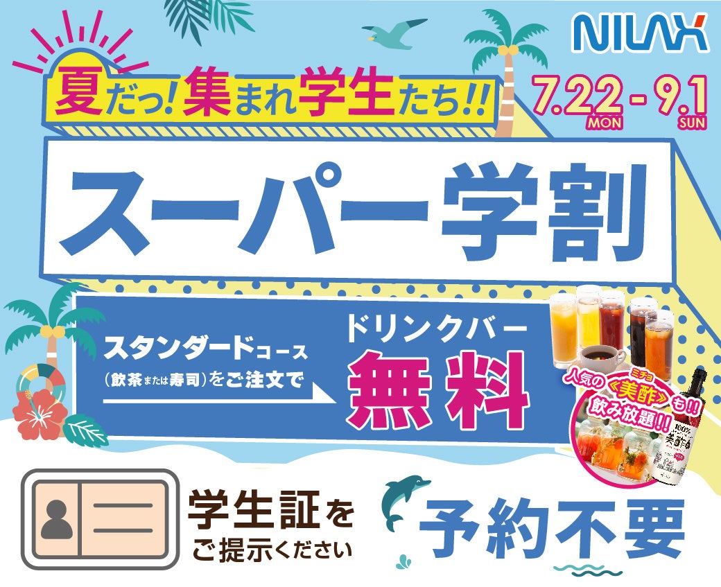 【学生必見!2人以上でドリンクバー無料!】ニラックスブッフェ32店舗にて夏の学生応援『スーパー学割キャンペーン』を開催!スタンダードコースのご利用でドリンクバーが無料!夏休みはブッフェで決まり!