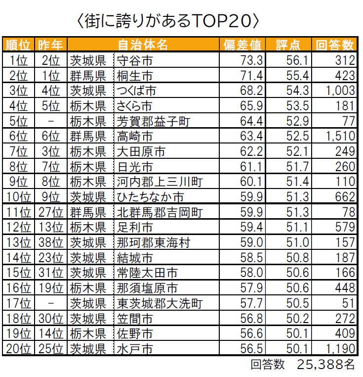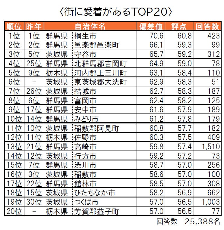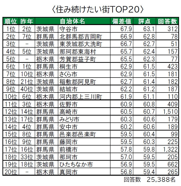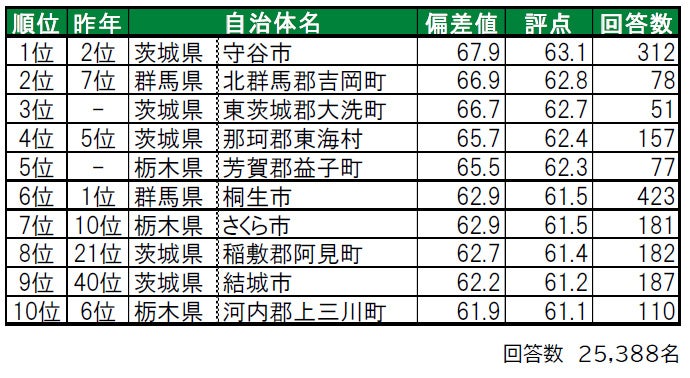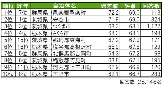 1位は、「街の幸福度」でも2位の高評価を得ている茨城県守谷市です。2位は群馬県北群馬郡吉岡町で、「街に愛着がある」では4位となっています。3位は、昨年は累計回答数が50名未満のためランキング集計対象外だった茨城県東茨城郡大洗町です。