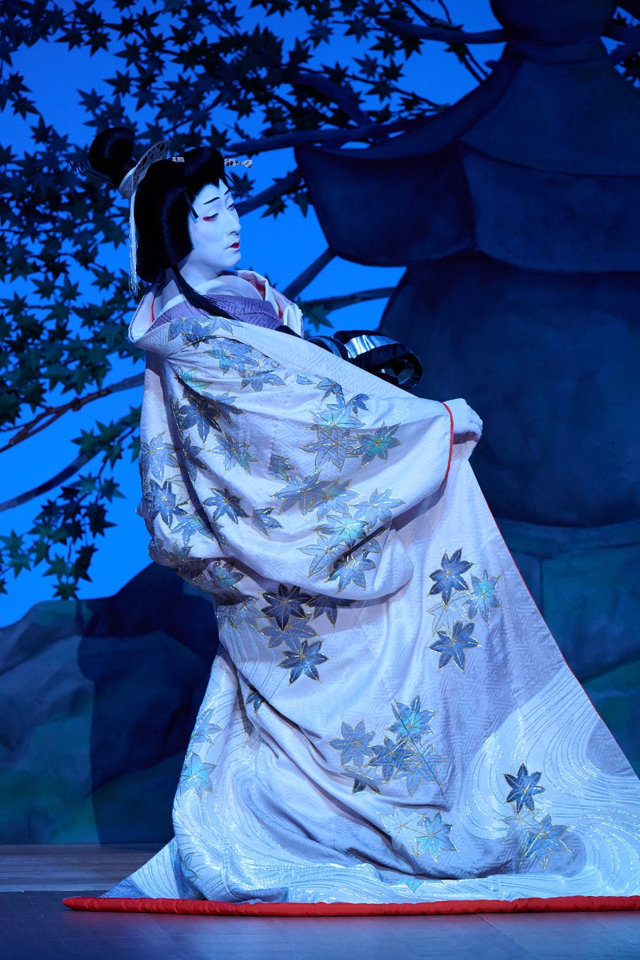 次はいよいよ『高尾懺悔』の上演。大きなもみじの樹と石灯篭の舞台セットの後ろから登場した高尾太夫(七之助)は、儚げな美しさで客席からは思わずため息が。本作の高尾については諸説あるものの、伊達騒動のきっかけとなった“仙台高尾”(2代目の高尾太夫)がモデルとされている。華々しい世界に生きているように見えて、家の事情で売られてきた悲しみや色々な人を裏切ったことで陥る地獄の責め苦など、吉原の影の部分を繊細な表現で踊り継いでゆく七之助。長唄の歌詞も美しく、舞踊の神髄を堪能できる演目だ。