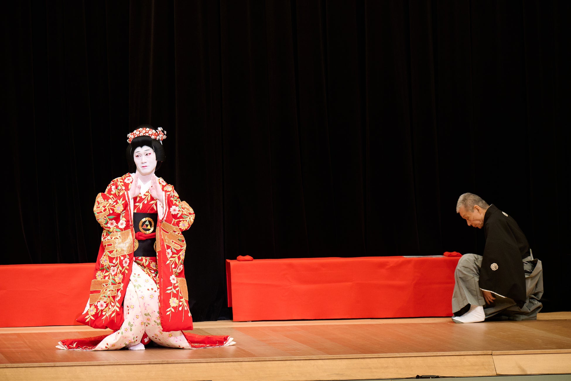後半は、舞台上で演者につく後見(こうけん)の仕事について小三郎から説明が。「踊り手と音楽、それから後見と、3人で息を合わせないと出来ません」とは、中村屋のベテランならではの貴重な言葉だ。続いて中村仲四郎が実際に『京鹿子娘道成寺』のワンシーンを踊り、小三郎が後見の仕事“引抜(ひきぬき)”を実演。二重に着こんだ衣裳をたった8本の糸を引き抜いて別の衣裳にガラリと変えてみせると、客席から大きな拍手が送られていた。