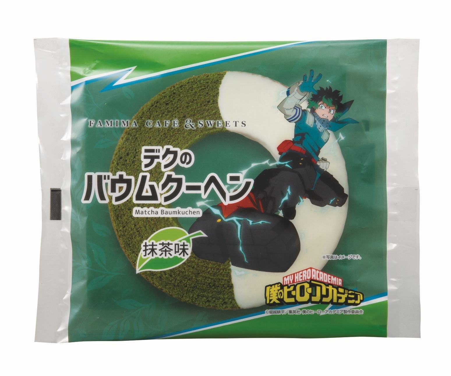 【内容】主人公デクのイメージカラーに合わせた抹茶味のバウムクーヘンです。ホワイトチョコを半掛けしました。