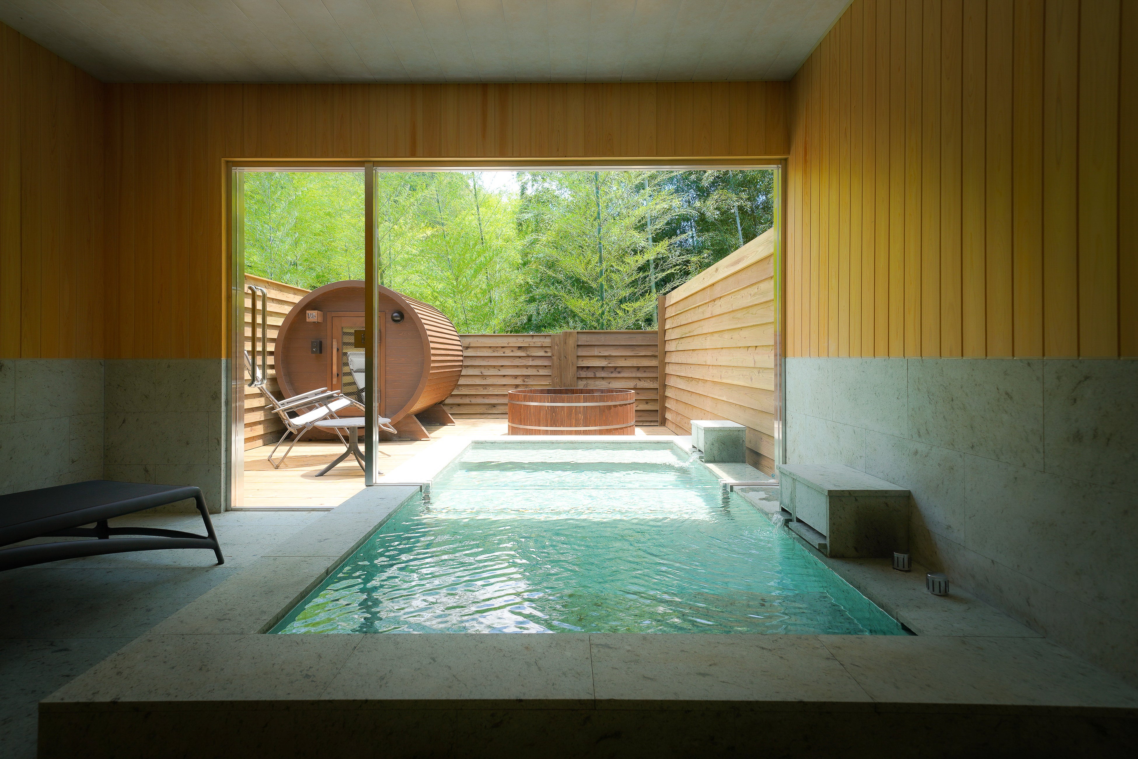 寝室棟と源泉かけ流しの客室温泉、そしてプライベートサウナが並びます。