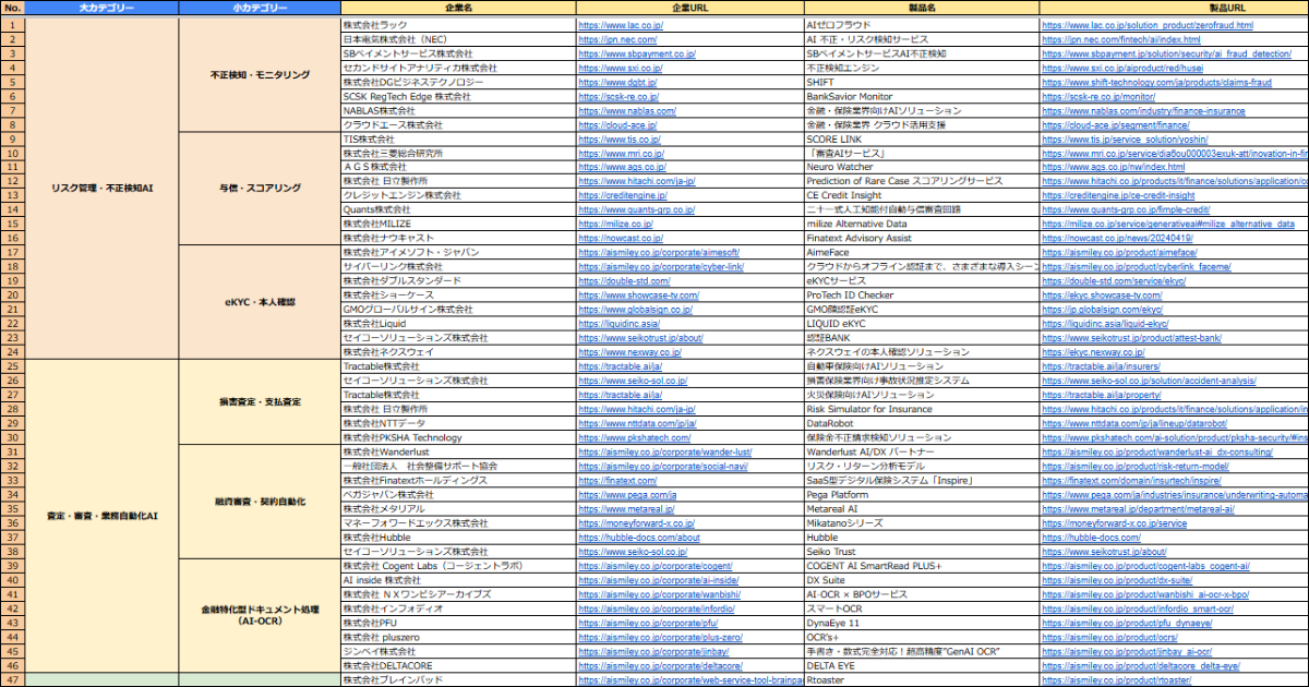 カオスマップを資料請求いただいた方には、各製品の製品名や製品URL情報を記載した「金融・保険業界向けAIソリューション提供企業リスト(Excel)」も併せて無償でご提供いたします。