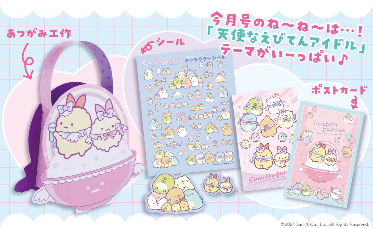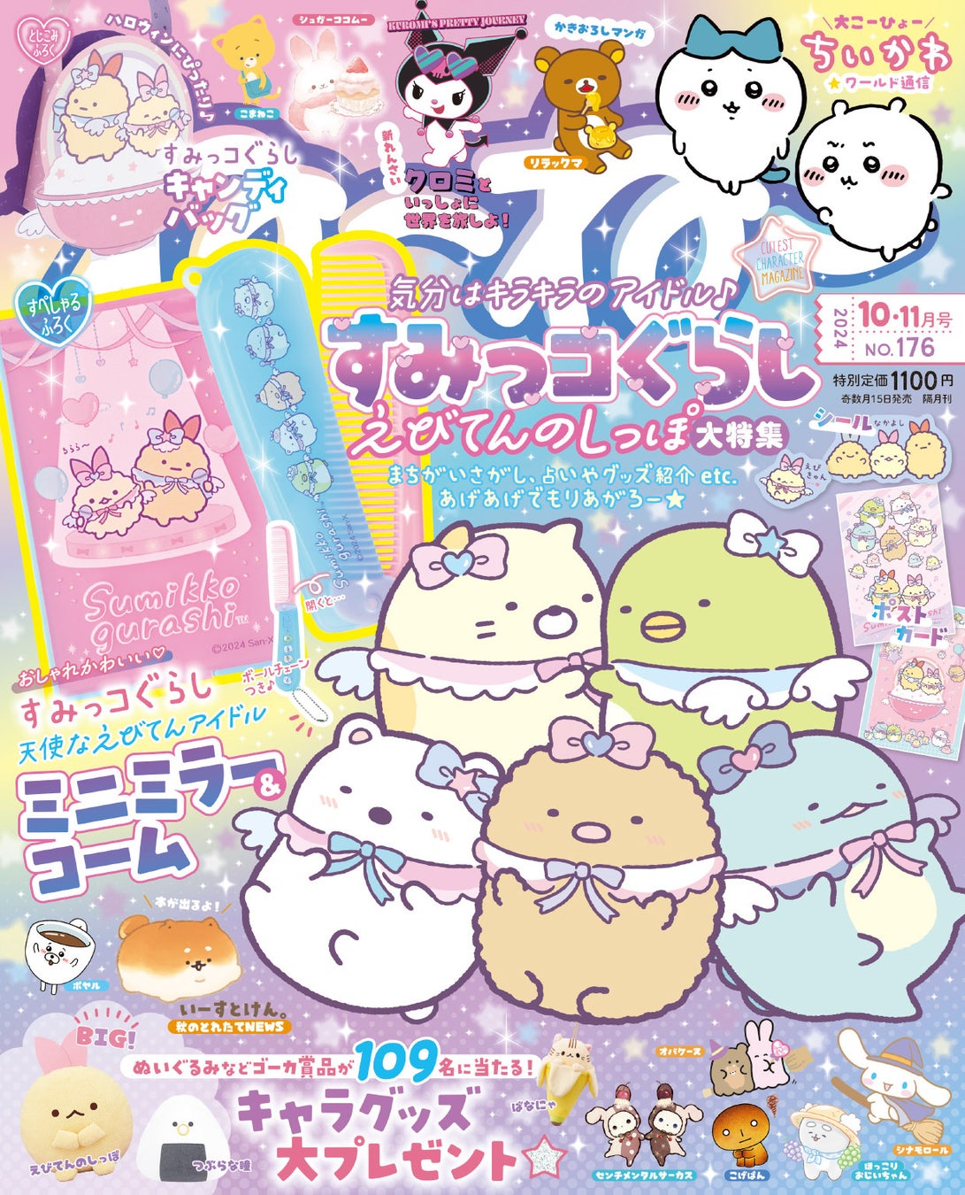 今号の『ねーねー』の表紙は、すみっコぐらしの「天使なえびてんアイドル」テーマのイラストが目印! スペシャル付録のミラー&コームをはじめ、あつがみ工作やシール、ポストカードなど新キャラ「えびてんのしっぽ」&「えびふらいのしっぽ」のかわいいデザインがいっぱい♪ 他にも、新連載「クロミといっしょに世界を旅しよ!」がスタート♪ 来年のカレンダーの紹介や人気連載の「ちいかわ☆ワールド通信」などなど、見どころ盛りだくさんです!