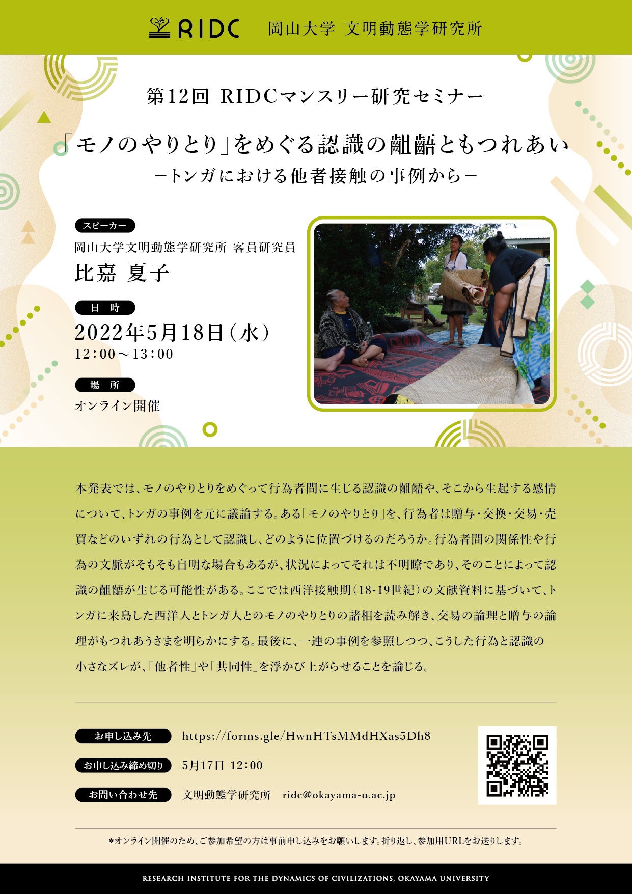 今回、 2022年5月18日(水)にオンライン開催しました第12回RIDCマンスリー研究セミナー「「モノのやりとり」をめぐる認識の齟齬ともつれあいートンガにおける他者接触の事例からー」(スピーカー:比嘉夏子 岡山大学文明動態学研究所 客員研究員)の録画配信を開始しました。ぜひ皆様にご視聴頂けますと幸いです。