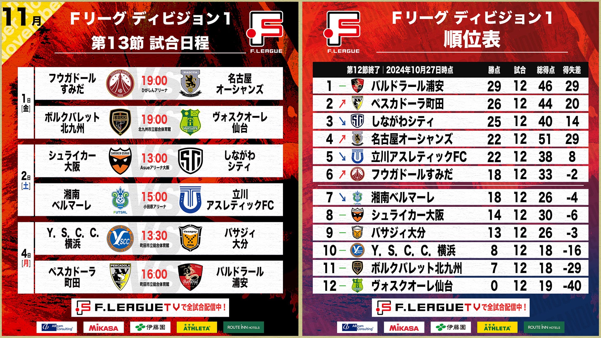 【F1第13節|11月1日〜4日 試合情報】会場情報/チケット情報/注目ポイントは?【Fリーグ2024-2025 ディビジョン1】今こそ最高のフットサルを