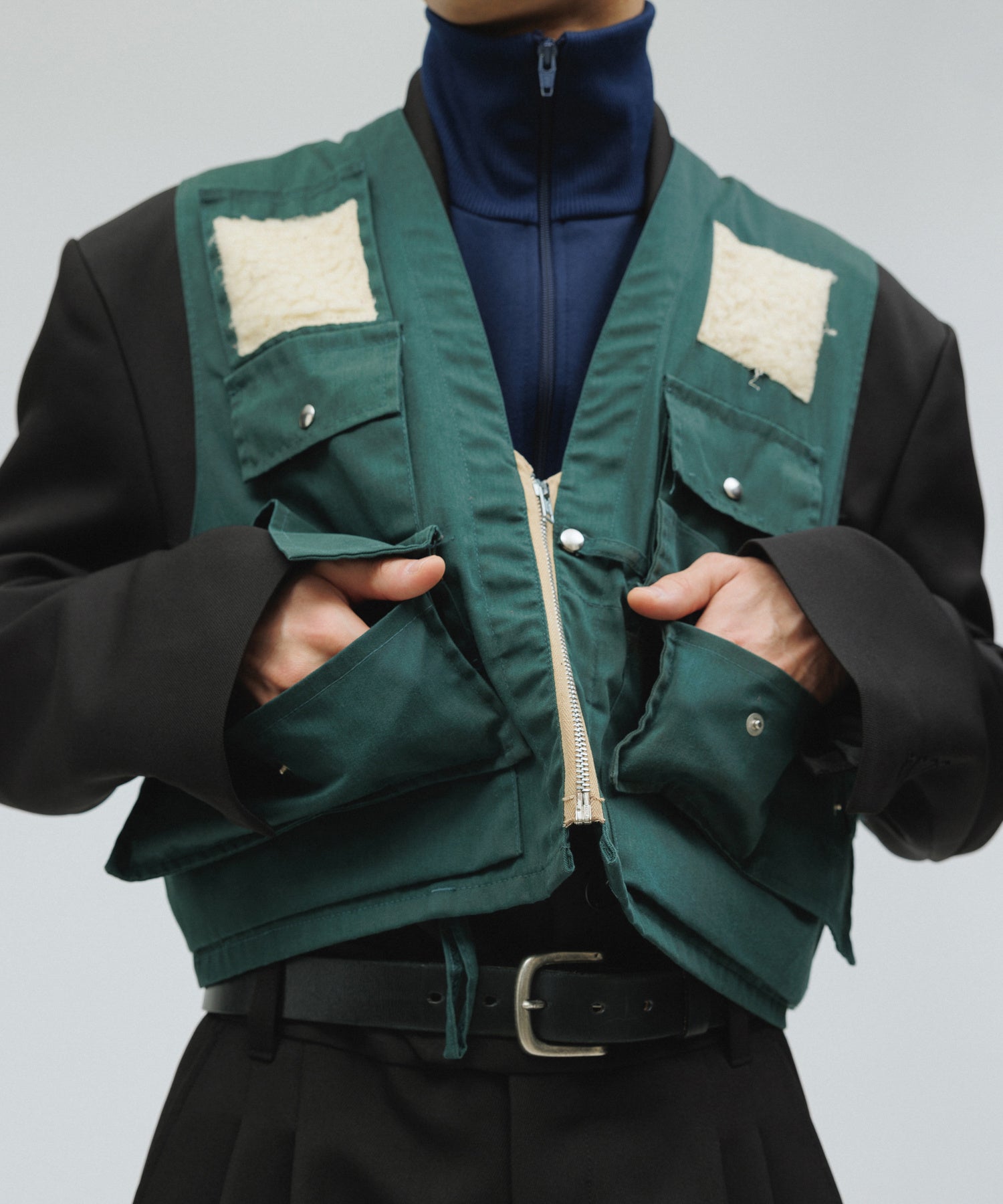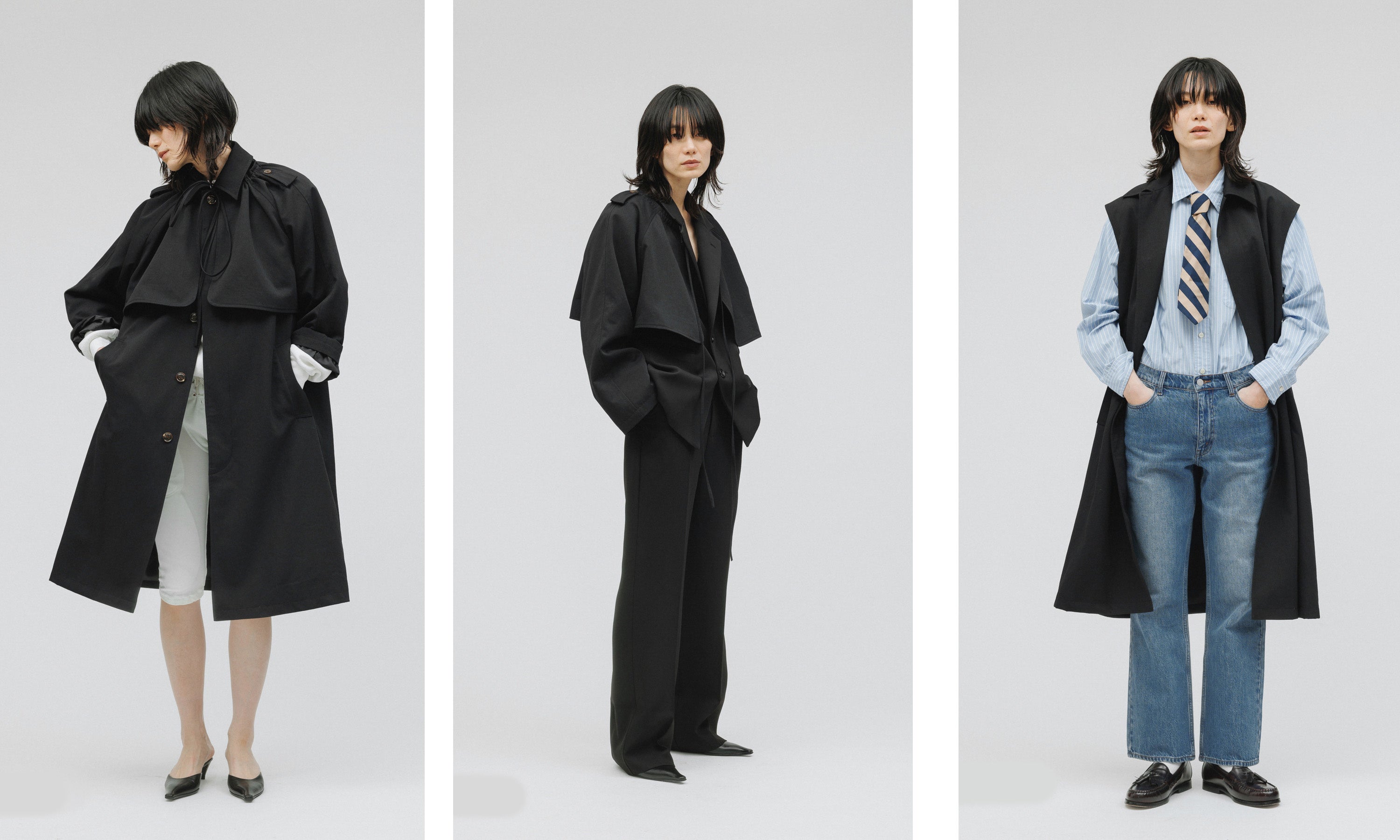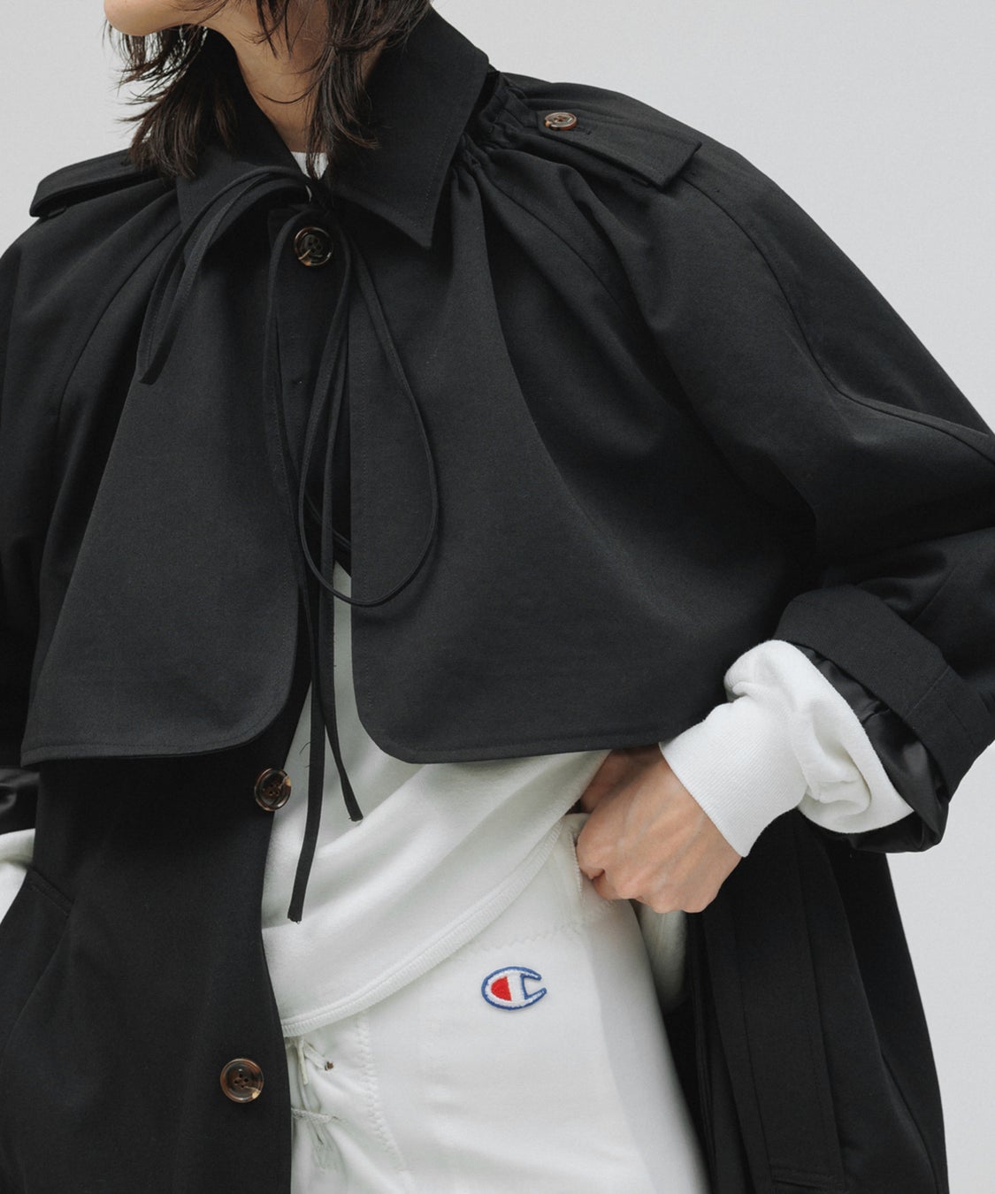 3バリエーションのコーディネートができるように、トレンチをボレロとノースリーブコートとの2パーツに分けたデザイン。それぞれのピースが単品として生きてくるようにバランスを整えた2ピース。ノースリーブのコートはアームホールのカットや、身幅、着丈のバランスを調整して、綺麗になりすぎないようにあえて野暮ったさを感じるシルエット感になっています。ボレロは首ぐり部分にドローコードを入れて、立体的なシルエットを作りました。合わせて着た時は、ショートケープのついた遊びのあるトレンチコートとして着ていただけます。