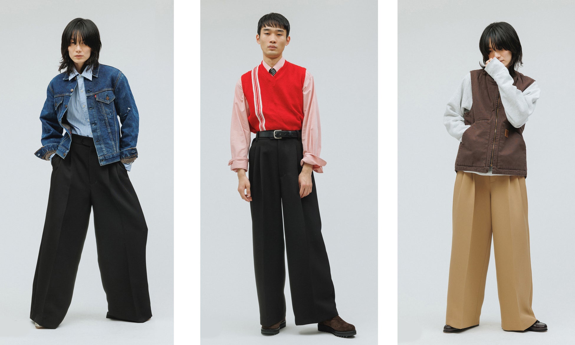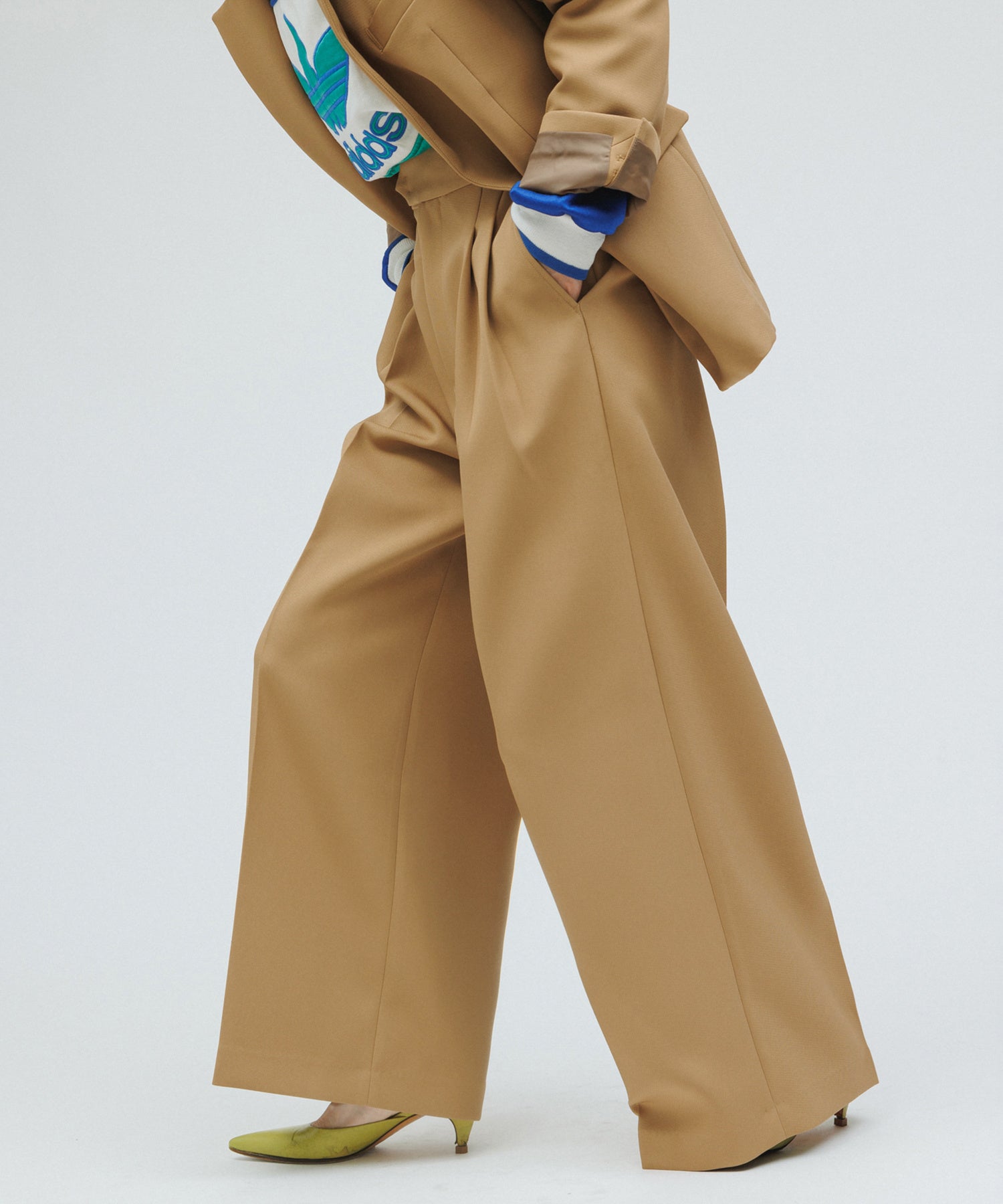 印象的なワイドシルエットのパンツはセンタープレスが入ることですっきりとした印象に。ベルト裏にはメンズライクなマーベルトを採用、太めのベルトループや、2タックとのディテールなどウェスト周りにデザインアクセントを置いたことで新鮮でアップデートされたワイドパンツが完成しました。マニッシュなSETUPにビスチェ等を合わせてセンシュアルなスタイリングもおすすめ。
