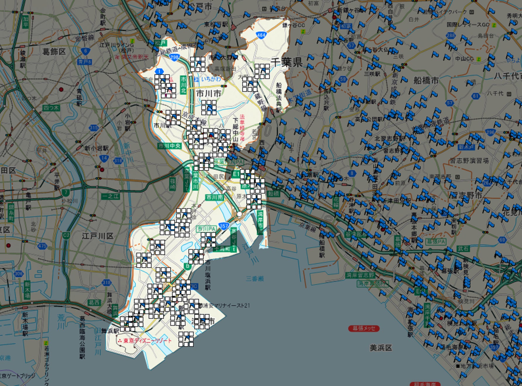 行政区域強調表示機能を拡張し、これまで1つだけしか選べなかった行政区域を複数選択して強調表示ができるようになりました。さらに、選択指定した行政区域内に含まれる店舗や顧客などの管理情報をワンタッチで抽出できる機能、地図上に表示したい情報フォルダをチェックボックスでON/OFFできる機能を追加したことで、顧客管理や商圏分析などにもかんたんにお役立ていただけます。