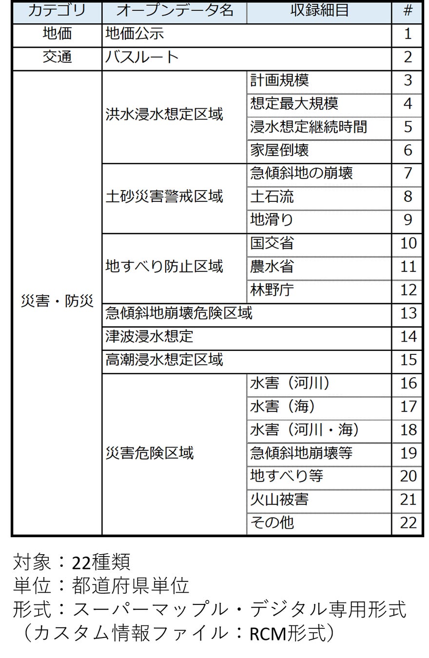 各所で公開されているオープンデータの種別と有用性を知ってもらうことを目的に、無償でご利用いただけるダウンロードサイト(https://biz.mapple.com/smd-rcm/)を新たに開設します。