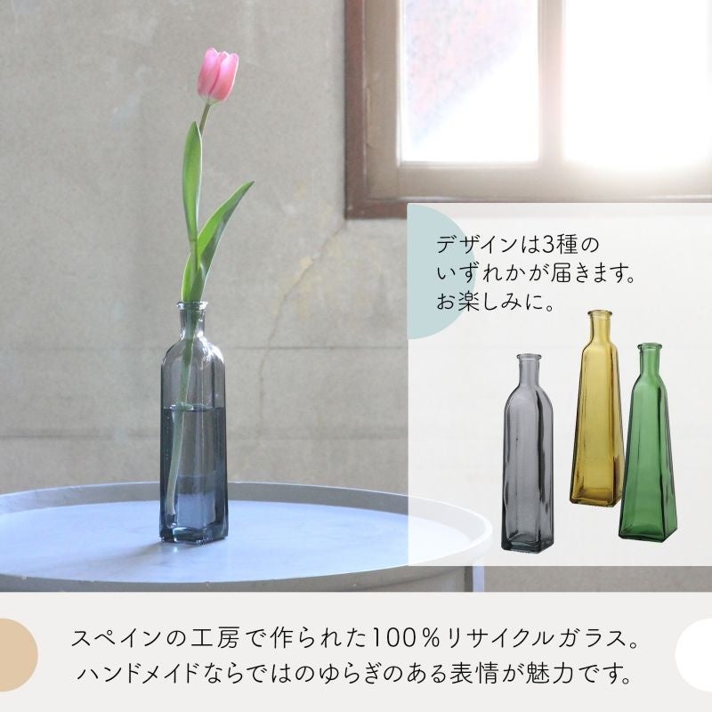 スペインバレンシア地方で職人の手によって作られた、100%リサイクルガラスのフラワーベース。一輪だけでもブラワーベースとの相性がよく、インテリアを彩ります。価格:1,045円(税込)