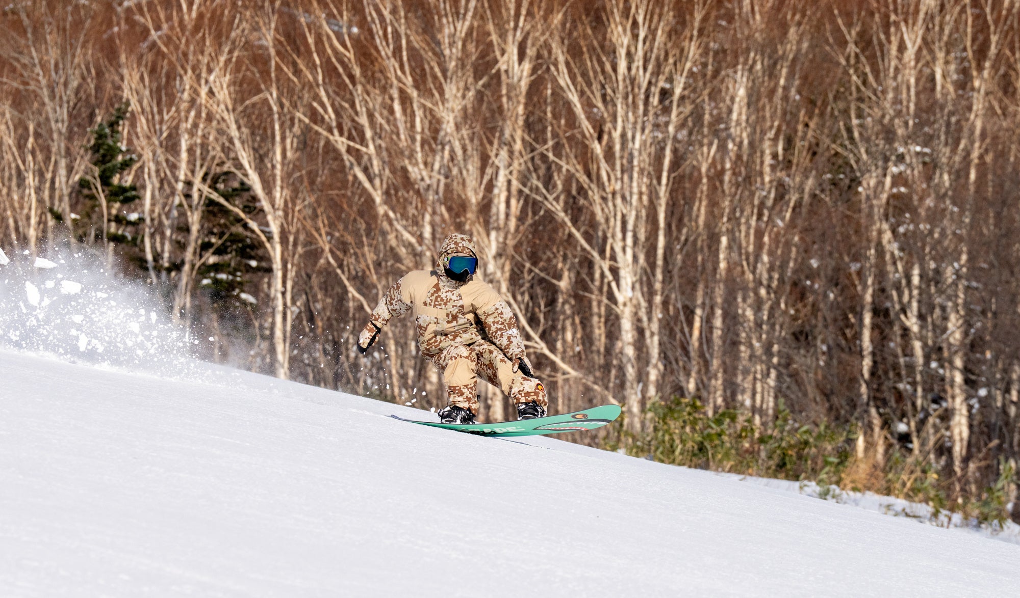 倉石氏の視点でデザインされたウェアやグラフィックを施したボードは、ゲレンデの白銀とコントラストを成し、ライダーたちの動きを視覚的にも際立たせた。