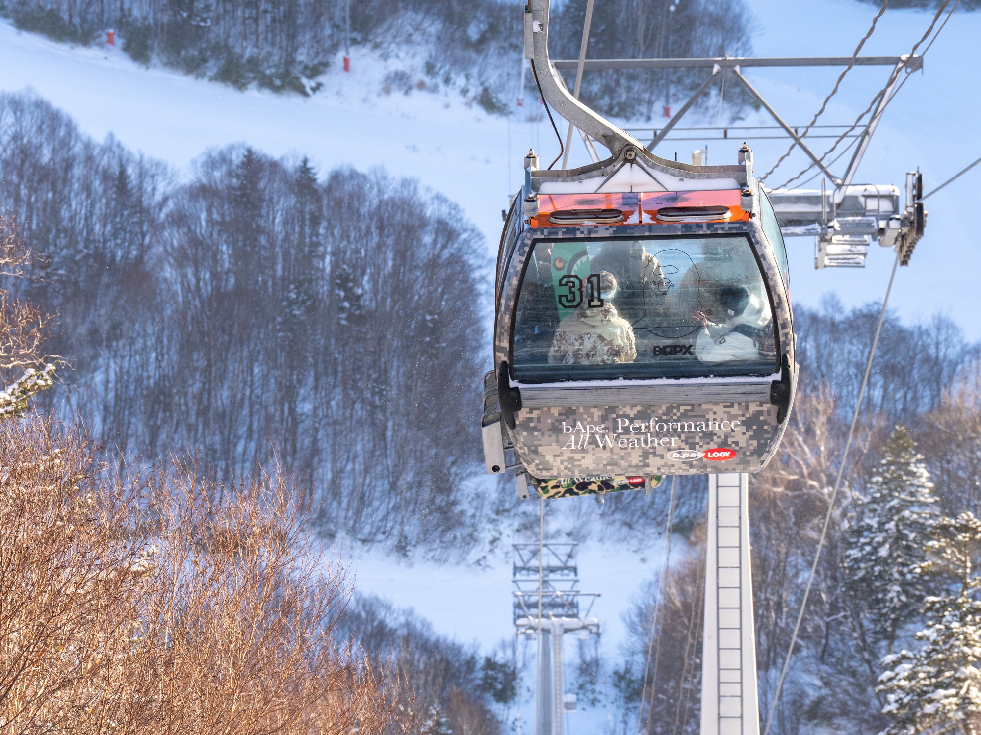 山麓から山頂へと向かうゴンドラには、今回のコレクションのビジュアルで全面ラッピングが施された特別仕様のキャビンが登場。