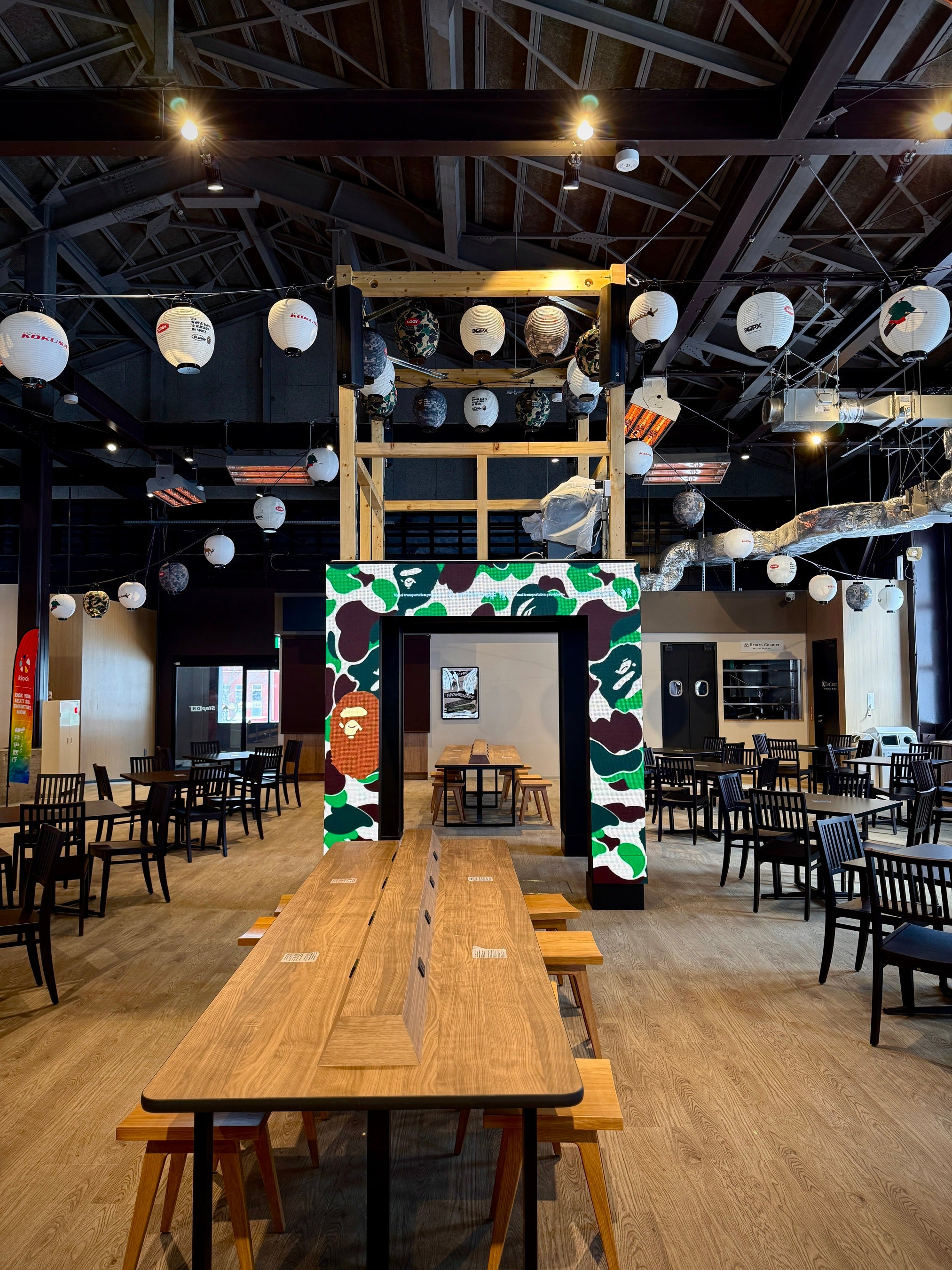 テラスには、フォトスポットとして巨大APE HEADバルーンが設置され、テラスの壁面には、UAP CAMOのパターンとともに、PAWコレクションのスローガン「THE WHOLE EARTH IS ALREADY IN SPACE(地球全体がすでに宇宙にある)」が描かれ、雪景色をバックにブランドのアイコニックなシンボルが浮かび上がった。