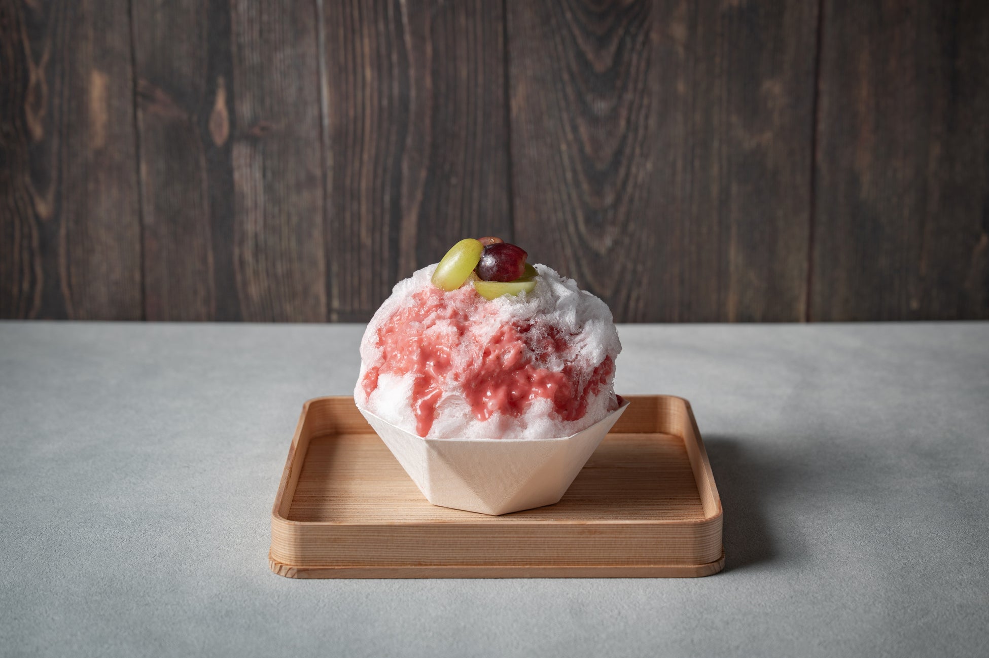 自家製ミルクソースをベースに、中には冷えた舌を和らげてくれるパンナコッタとシャインマスカットのソースを忍ばせました。トップにはいちじくを火入れしとろとろプチプチに仕上げた甘いソースと、トッピングにはフレッシュのシャインマスカットと巨峰でアクセントに。オーロラのような色鮮やかなかき氷です。